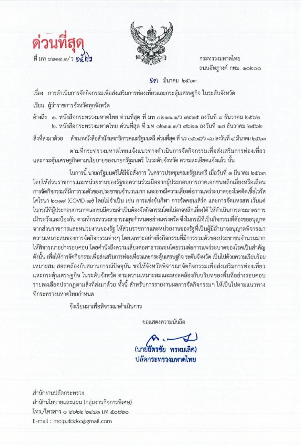 และขอให้ทุกจังหวัดพิจารณาจัดกิจกรรมเพื่อส่งเสริมการท่องเที่ยวและกระตุ้นเศรษฐกิจในจังหวัดตามความเหมาะสมและบริบทของพื้นที่