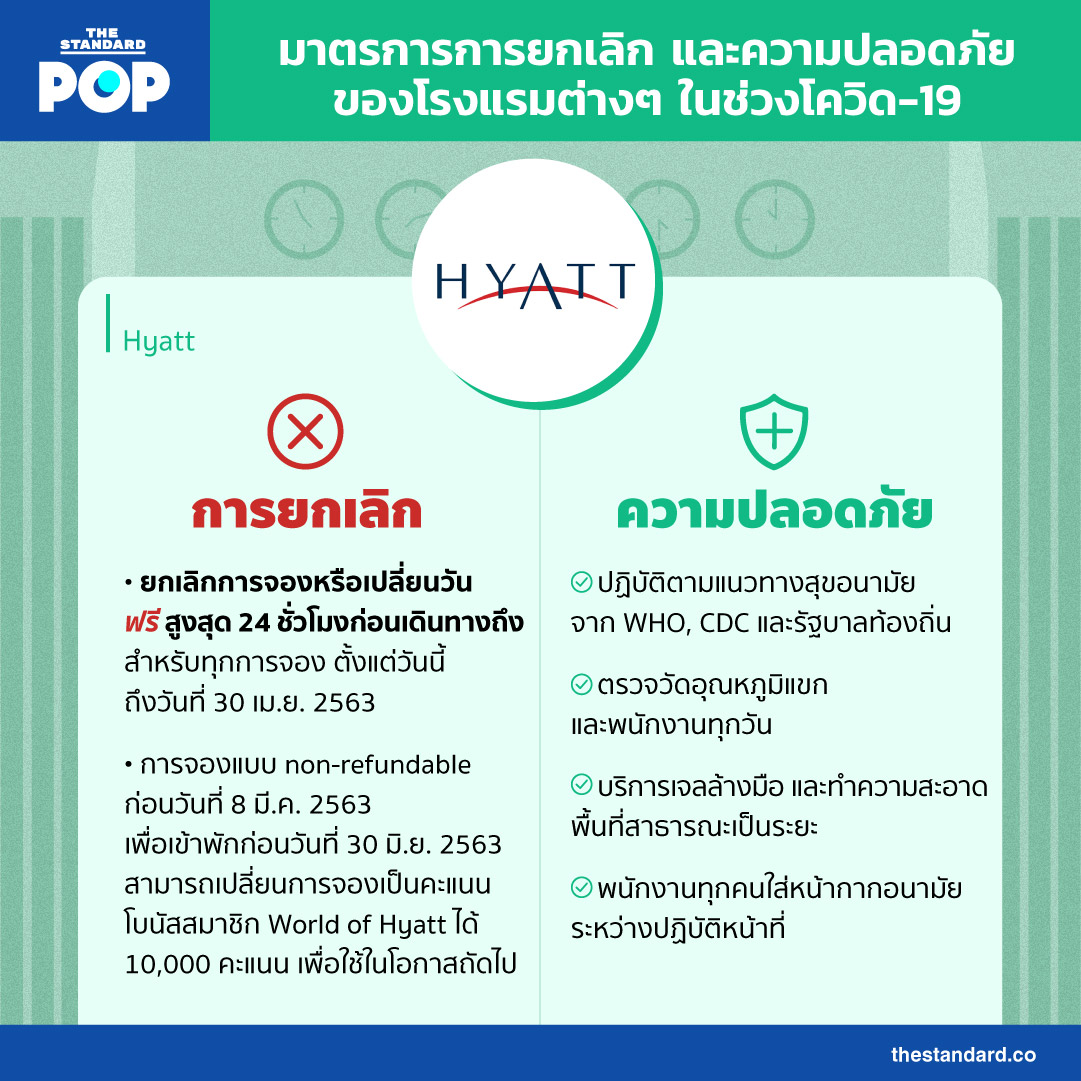 ในขณะที่ทั่วโลกกำลังเผชิญกับการแพร่ระบาดของโควิด-19 แน่นอนว่าธุรกิจท่องเที่ยวย่อมได้รับผลกระทบโดยตรง นักท่องเที่ยวหลายคนตัดสินใจยกเลิกทริปพักผ่อน เพราะนโยบายป้องกันการระบาดของแต่ละประเทศ บางส่วนก็ไม่มั่นใจเรื่องมาตรการความสะอาด THE STANDARD POP รวบรวมเงื่อนไขการยกเลิก และความปลอดภัยของโรงแรมต่างๆ ในช่วงโควิด-19 ของเครือโรงแรมใหญ่ๆ ทั่วโลกมาฝากไว้เป็นข้อมูล