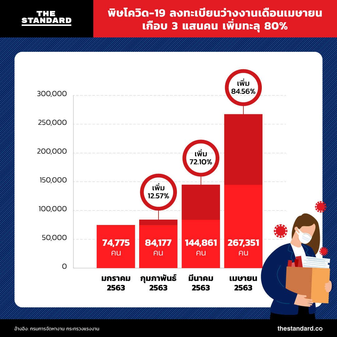 THE STANDARD ตรวจสอบข้อมูลย้อนหลังจากกรมการจัดหางาน กระทรวงแรงงาน พบว่า เดือนเมษายน 2563 มีผู้ลงทะเบียน 267,351 คน เพิ่ม 84.56% จากเดือนมีนาคม 2563 ที่มีผู้ลงทะเบียน 144,861 คน และหากดูย้อนหลังไปถึงเดือนมกราคม จะเห็นว่าตัวเลขผู้มาลงทะเบียนว่างงานเพิ่มสูงขึ้นอย่างก้าวกระโดดในเดือนมีนาคม ซึ่งมากกว่าเดือนกุมภาพันธ์ถึง 72.10%