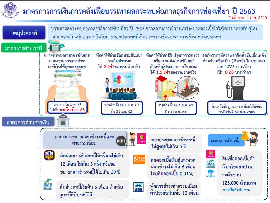 ลวรณ แสงสนิท ผู้อำนวยการสำนักงานเศรษฐกิจการคลัง ในฐานะโฆษกกระทรวงการคลัง ประเมินว่าเศรษฐกิจไทยปี 2563 จะขยายตัว 2.8% ภายใต้สมมติฐานการแพร่ระบาดของไวรัสโคโรนาจบลงในช่วง 3 เดือน ขณะเดียวกันภาคการท่องเที่ยวของไทยจะได้รับผลกระทบจากการแพร่ระบาดของไวรัสโคโรนา ทำให้มติคณะรัฐมนตรีในวันที่ 4 กุมภาพันธ์ 2563 เห็นชอบมาตรการการเงินการคลังเพื่อบรรเทาผลกระทบต่อภาคธุรกิจการท่องเที่ยว ปี 2563 ที่ได้รับผลกระทบจากการแพร่ระบาดของไวรัสโคโรนาสายพันธุ์ใหม่ตามที่กระทรวงการคลังเสนอ โดยจะออกมาตรการด้านภาษี 4 มาตรการ ได้แก่