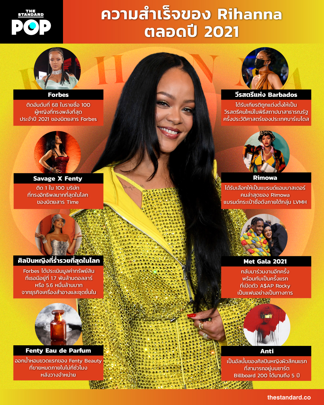 ความสำเร็จของ Rihanna ในปี 2021 ไม่เดาก็รู้ว่าแทบไม่มีเรื่องผลงานเพลงชุดใหม่ แต่เป็นความสำเร็จที่เกิดขึ้นจากอาณาจักรแฟชั่นและความงามจากธุรกิจลูกรักทั้งสองของเธออย่าง Fenty Beauty และ Savage X Fenty ที่ส่งผลให้เธอขึ้นแท่นศิลปินหญิงที่ร่ำรวยที่สุดในโลก และชื่อเสียงของเธอก็ยังทรงพลังถึงขึ้นได้ถูกแต่งตั้งให้เป็นวีรสตรีคนใหม่ในพิธีสถาปนาสาธารณรัฐครั้งประวัติศาสตร์ของประเทศบาร์เบโดส บ้านเกิดของเธอ