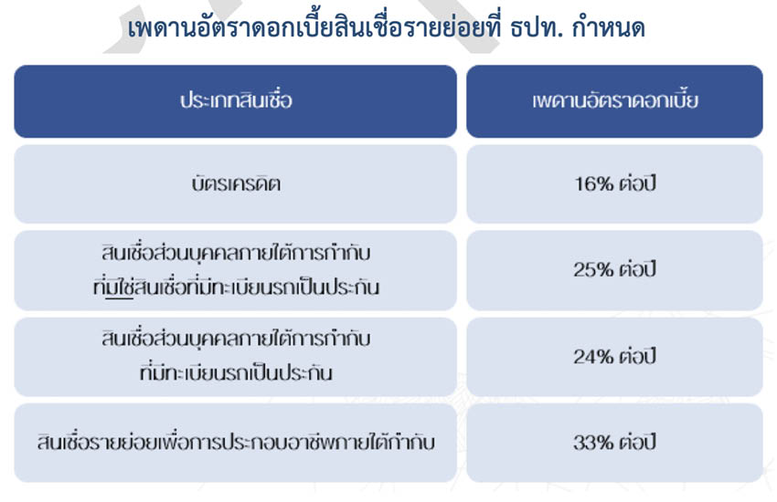 - สินเชื่อรายย่อยเพื่อการประกอบอาชีพภายใต้กำกับ มีเพดานอัตราดอกเบี้ยที่ 33% ต่อปี