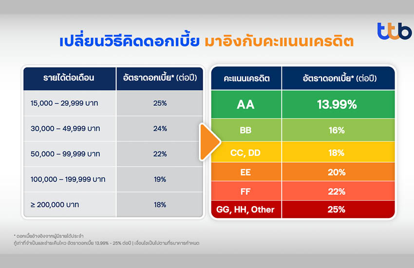 โดยแนวทางการพิจารณาระบบคิดอัตราดอกเบี้ยแบบใหม่นี้ จะเริ่มนำร่องกับสินเชื่อบุคคล ‘ทีทีบี แคชทูโก’ ที่มีอัตราดอกเบี้ยจะเริ่มต้นเพียง 13.99% ต่อปี สำหรับผู้มีรายได้ประจำ คงที่เรทเดียวตลอดสัญญา (จากเดิมที่อัตราดอกเบี้ยมักสูงถึง 25%) วงเงินสูงสุด 2 ล้านบาทหรือ 5 เท่าของรายได้เฉลี่ยต่อเดือน และเลือกผ่อนได้นานสูงสุดถึง 72 เดือน