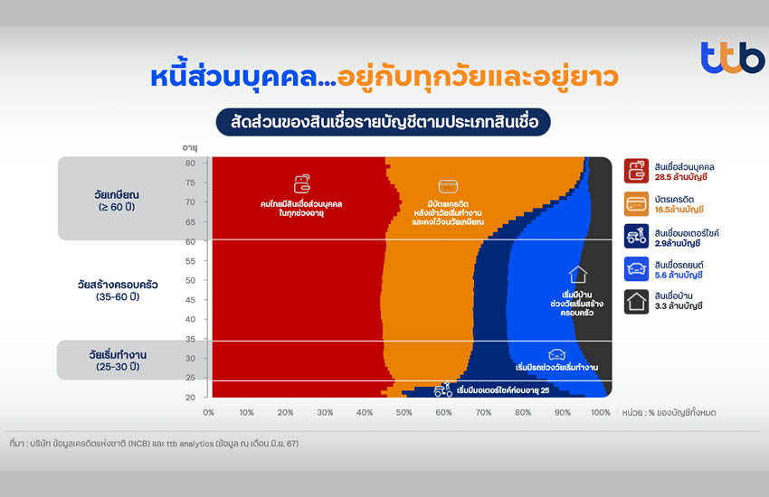 ฐากรกล่าวต่อว่า สาเหตุที่ต้องการเริ่มใช้กลไก Risk-based Pricing กับ ‘สินเชื่อส่วนบุคคล’ ก่อนเนื่องจากพบว่า ตามข้อมูลจาก NCB ชี้ว่า ‘สินเชื่อส่วนบุคคล’ หนี้ที่คนไทยมีมากที่สุด คิดเป็นสัดส่วนถึง 43% ของหนี้ทั้งหมด และมีอยู่ในทุกช่วงอายุตั้งแต่วัยทำงานจนถึงวัยเกษียณ