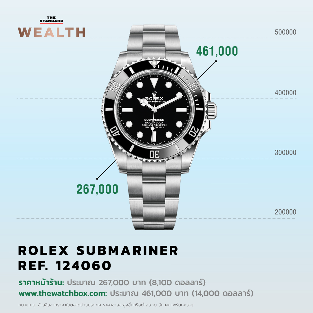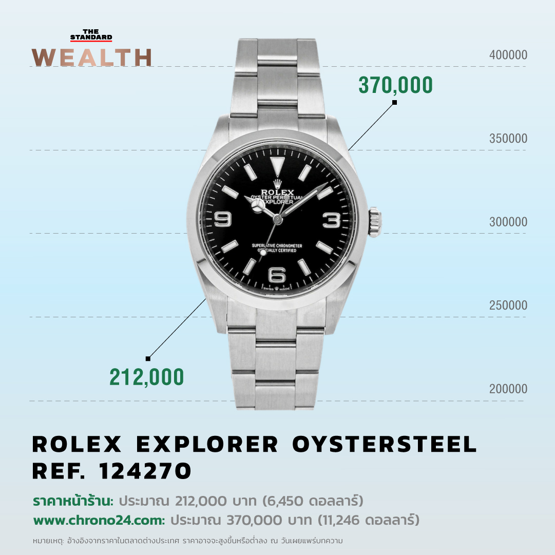 เมื่อเร็วๆ นี้เว็บไซต์ของนิตยสาร Robb Report ที่ว่าด้วยสินค้าหรูหราสำหรับมหาเศรษฐีรายงานว่า Rolex รุ่นใหม่จากตัวแทนจำหน่ายอย่างเป็นทางการเมื่อนำมาขายในตลาดรีเซล ราคาอาจจะพุ่งขึ้นมาก เช่น Rolex Explorer ขนาด 36 มม. Oystersteel รุ่นใหม่ (Ref. 124270) ที่เพิ่งเปิดตัวในงาน Watches and Wonders ที่เจนีวา เมื่อเดือนเมษายนมีราคาอยู่ที่ราวๆ 212,000 บาท (6,450 ดอลลาร์) แต่ขายอยู่ในเว็บไซต์ของ Chrono24 ด้วยราคาราวๆ 329,000 (10,026 ดอลลาร์) ถึง 370,000 บาท (11,246 ดอลลาร์) หรือ Rolex Explorer Two-Tone ขนาด 36 มม. (Ref. 124273) มีราคาขายหน้าร้านอยู่ที่ 356,000 บาท (10,800 ดอลลาร์) ก็ขายอยู่บนเว็บไซต์ The WatchBox ด้วยราคาประมาณ 494,000 บาท (15,000 ดอลลาร์) เป็นต้น