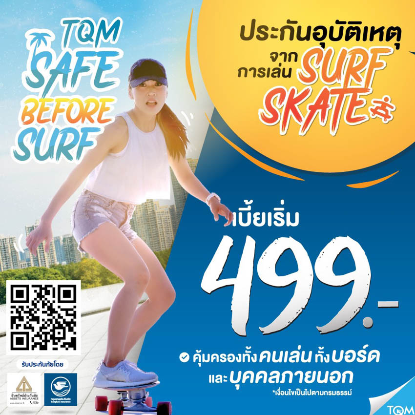 จนถึงตอนนี้กระแสเซิร์ฟสเกตก็ยังแรงต่อเนื่อง กลุ่มคนที่สนใจก็เริ่มขยายวงกว้างขึ้น ตั้งแต่เด็กไปจนถึงวัยกลางคน ธุรกิจต่างๆ กระโดดลงมาร่วมเป็นส่วนหนึ่งในการสนับสนุนกีฬาเอ็กซ์ตรีมชนิดนี้กันอย่างคึกคัก ไม่เว้นแม้แต่ธุรกิจโบรกเกอร์ประกันเจ้าดังอย่าง บริษัท ทีคิวเอ็ม อินชัวร์รันส์ โบรคเกอร์ จำกัด ที่ครั้งนี้นอกจากจะนำอินไซต์ของกลุ่มเป้าหมายจริงมาออกแบบโปรดักต์ประกัน Surf Skate ภายใต้คอนเซปต์ ‘Safe Before Surf เจ็บมา พังมา TQM ดูแล’ คุ้มครองแบบครบทั้งคน บอร์ด และความรับผิดชอบต่อร่างกายและทรัพย์สินของบุคคลภายนอก รวมถึงการผนึกกำลังกับพันธมิตรหลักอย่างบริษัท กรุงเทพประกันภัย จำกัด (มหาชน) หรือ BKI และบริษัท สินทรัพย์ประกันภัย จำกัด (มหาชน) หรือ AIC แล้ว เบื้องหลังการออกแบบประกัน Surf Skate ยังมีจุดเริ่มต้นมาจากทายาทรุ่นที่ 4 แพนพิทย์ พรรณนิภา Project Owner บริษัท ทีคิวเอ็ม อินชัวร์รันส์ โบรคเกอร์ จำกัด ในวัย 19 ปีเท่านั้น