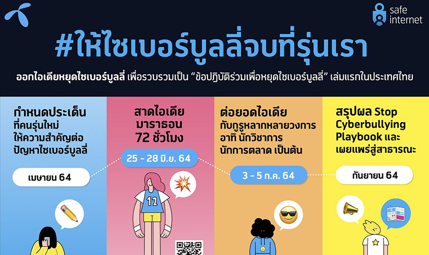 สำหรับพื้นที่ที่เปิดโอกาสให้คนรุ่นใหม่มาส่งเสียงเพื่อ #ให้ไซเบอร์บูลลี่จบที่รุ่นเรา ได้รับการสนับสนุนจากโครงการ Safe Internet โดย dtac ซึ่งดำเนินโครงการนี้มาตั้งแต่ปี 2557 โดยมีเป้าหมายสูงสุดเพื่อสร้างทักษะและภูมิคุ้มกันแก่เด็กและเยาวชน ให้สามารถท่องโลกออนไลน์ได้อย่างปลอดภัย เหมาะสม และสร้างสรรค์ ผ่านการสร้างความรู้และทักษะที่จำเป็นแก่ตัวเด็กและบุคคลที่อยู่ใกล้เคียง ไม่ว่าจะเป็น ครู พ่อแม่ หรือผู้ปกครอง