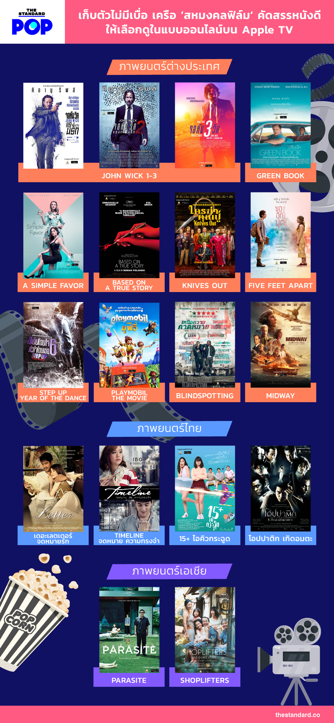 ล่าสุด สหมงคลฟิล์ม อินเตอร์เนชั่นแนล (Sahamongkolfilm International), มงคลภาพยนตร์ (Mongkol Cinema) และมงคลเมเจอร์ (Mongkol Major) คัดทั้งหนังดูสนุกระดับท็อปบล็อกบัสเตอร์ หนังดีระดับออสการ์ หนังเอเชียคุณภาพ และหนังไทยชั้นดี มาให้ได้เลือกดูในแบบออนไลน์บน Apple TV แถมดูกันได้แบบไม่มีวันหมดอายุ ไม่ต้องต่อสัญญา โดยจะเริ่มต้นตั้งแต่วันที่ 8 พฤษภาคม 2563 เป็นต้นไป ส่วนมีเรื่องอะไรน่าสนใจบ้าง THE STANDARD POP จัดสรรไว้ให้แล้ว
