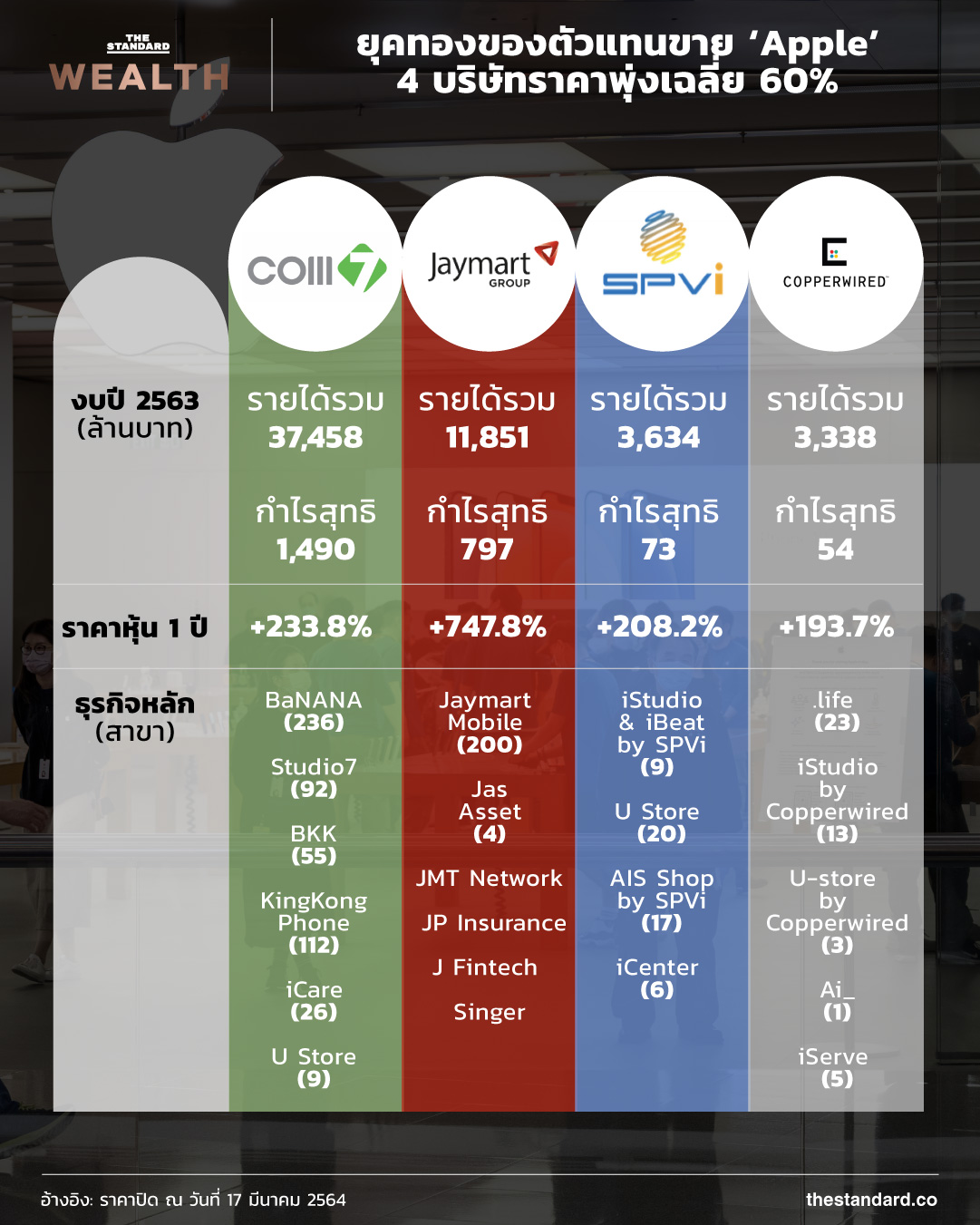 ราคาหุ้นของ 4 บริษัท ได้แก่ COM7, JMART, SPVI และ CPW ซึ่งทำธุรกิจตัวแทนขายสินค้าไอที โดยเฉพาะแบรนด์ Apple ซึ่งนักวิเคราะห์มองว่าจะช่วยหนุนให้ผลประกอบการของบริษัทเหล่านี้เติบโตโดดเด่นต่อเนื่องในปีนี้ ทั้งนี้ ราคาหุ้นของแต่ละบริษัทต่างพุ่งขึ้นสูงกว่า 100% สำหรับช่วง 1 ปีที่ผ่านมา ส่วนปี 2564 นี้ ราคาหุ้นของทั้ง 4 บริษัทปรับขึ้นเฉลี่ยกว่า 60%