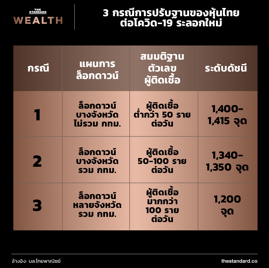 - จะเห็นล็อกดาวน์บางจังหวัด ไม่รวม กทม. ตลาดหุ้นอาจจะ -5% ดัชนีอาจจะปรับลงไปสู่ระดับ 1,400-1,415 จุด โดยสามารถควบคุมผู้ติดเชื้อได้ และมีรายงานผู้ติดเชื้อต่ำกว่า 50 รายต่อวัน การแพร่ระบาดอยู่ในพื้นที่จำกัด ในบางจังหวัดเท่านั้น