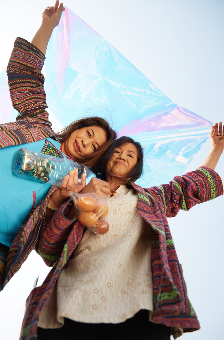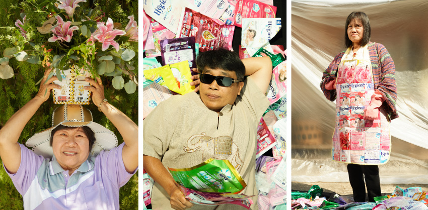 ลองมาดูผลงานสร้างสรรค์จากเศษวัสดุเหลือใช้หลังจากการคัดแยกในครัวเรือนของป้าเพ็ญและวรรณี เช่น หมวกและแจกันดอกไม้จากกล่องกระดาษ หรือจะเป็นผ้ากันเปื้อนที่สามารถใช้งานได้จริงจากซองน้ำยาปรับผ้านุ่มและน้ำยาซักผ้า ที่นอกจากจะช่วยเพิ่มรายได้ให้กับชุมชนแล้ว ยังช่วยให้ผู้สูงวัยมีกิจกรรมทำยามว่างอีกด้วย