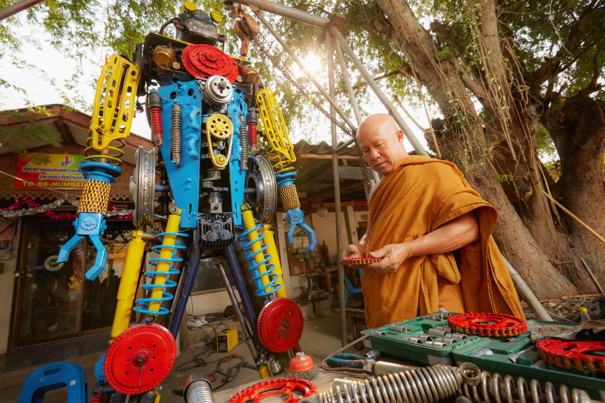 และพระครูวิธานสาธุกิจ เจ้าอาวาสวัดบ้านแป้นและเจ้าคณะตำบลบ้านสา หลวงพ่อนักประดิษฐ์ผู้ซึ่งเรียนรู้การสร้างประติมากรรมจากเศษเหล็ก อะไหล่เหลือใช้จากมอเตอร์ไซค์ และรถยนต์หุ่นยนต์จากสิ่งของเหลือใช้ผ่านช่องทางออนไลน์