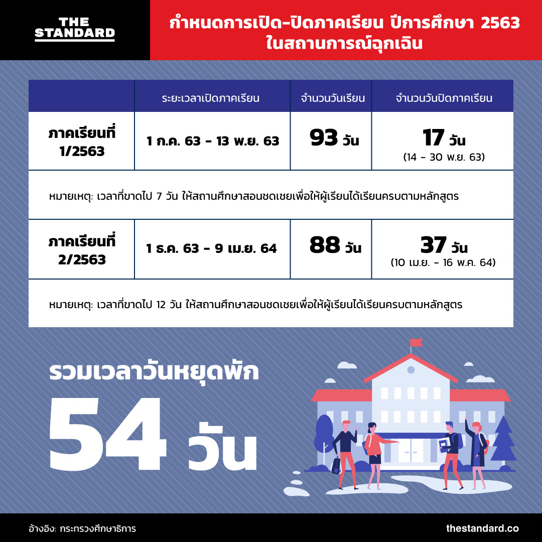 ณัฏฐพล ทีปสุวรรณ รัฐมนตรีว่าการกระทรวงศึกษาธิการ โพสต์ข้อความผ่านเพจเฟซบุ๊ก ‘Nataphol Teepsuwan – ณัฏฐพล ทีปสุวรรณ’ ให้ข้อมูลถึงรายละเอียดกำหนดการเปิด-ปิดภาคเรียน 2563 พร้อมข้อความระบุว่า “ต่อเนื่องจากแถลงการณ์ในครั้งที่ 2 ในประเด็นเรื่องการเพิ่มเวลาพัก ครั้งนี้มีการขยายผลเพิ่มเติมที่ผมขอนำมาอัปเดต โดยแบ่งการเรียนการสอนออกเป็น 2 เทอม แต่ละเทอมมีเวลาพักในเทอมที่ 1/2563 จำนวน 17 วัน และในภาคเรียนที่ 2/2563 จำนวน 37 วัน รวมทั้งสิ้น 54 วัน”