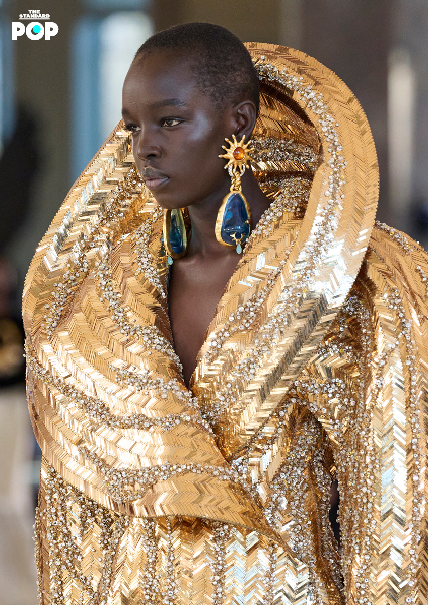 คอลเล็กชันนี้ยังยึดโทนสีหลักที่แบรนด์ใช้บ่อยมากที่สุด ได้แก่ สีดำ สีขาวอมน้ำตาลอ่อน (Ecru) และสีทองในเสื้อผ้าที่มีความเกินจริง (Surrealism) ตามแบบฉบับของ Schiaparelli ทั้งหมด 32 ลุค ตั้งแต่ชุดเดรสปกเสื้อขนาดมหึมา เสื้อแจ็กเก็ตที่มีดีเทลรูปทรงกรวยตรงเต้านม คอร์เซ็ตหล่อขึ้นรูปสีทองล้อมรอบด้วยวงแหวนดาวเคราะห์ ไปจนถึงเครื่องประดับเป็นกระเป๋าสีทองรูปศีรษะคนและลิ้นชักเก็บของ ต่างหูรูปดาวเสาร์แบบเดียวกับที่ Adele ใส่บนคอนเสิร์ต One Night Only และคลัตช์สีทองทรงขนมปังบาร์แกตต์