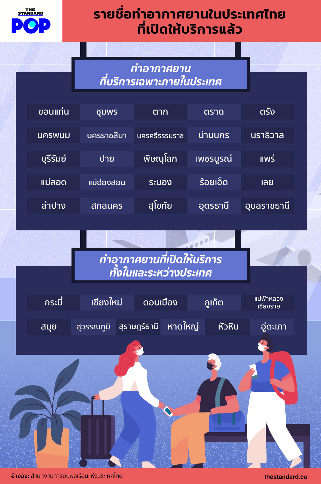 ตามประกาศสำนักงานการบินพลเรือนแห่งประเทศไทย เรื่อง เงื่อนไขและเงื่อนเวลาในการใช้ท่าอากาศยานเพื่อการขึ้นลงของอากาศยาน (ฉบับที่ 5) เมื่อวันที่ 12 มิถุนายน 2563 มาดูสิว่า มีท่าอากาศยานใดในประเทศไทยเปิดให้บริการแล้วบ้าง