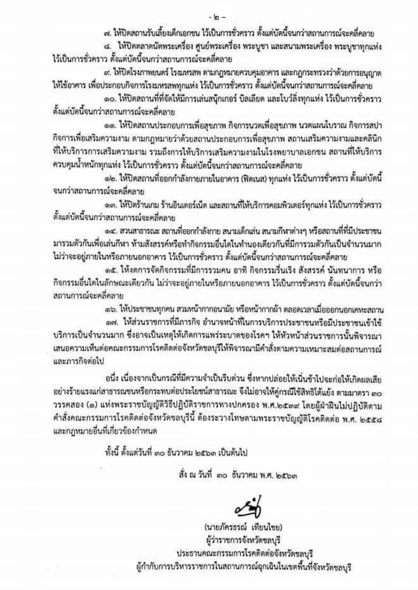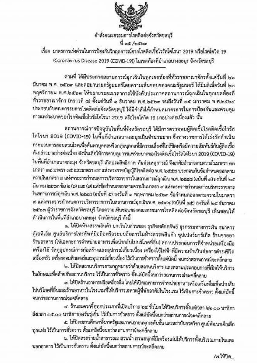 วันนี้ (30 ธันวาคม) ภัครธรณ์ เทียนไชย ผู้ว่าราชการจังหวัดชลบุรี ในฐานะประธานคณะกรรมการโรคติดต่อจังหวัดชลบุรี และผู้กำกับการบริหารราชการในสถานการณ์ฉุกเฉินในเขตพื้นที่ชลบุรี ได้ลงนามในคำสั่งคณะกรรมการโรคติดต่อจังหวัดชลบุรี ที่ 35/2563 ลงวันที่ 30 ธันวาคม 2563 เรื่อง มาตรการเร่งด่วนในการป้องกันวิกฤตการณ์จากโรคติดเชื้อไวรัสโคโรนา 2019 หรือโรคโควิด-19 เห็นชอบให้พื้นที่อำเภอบางละมุง จังหวัดชลบุรี