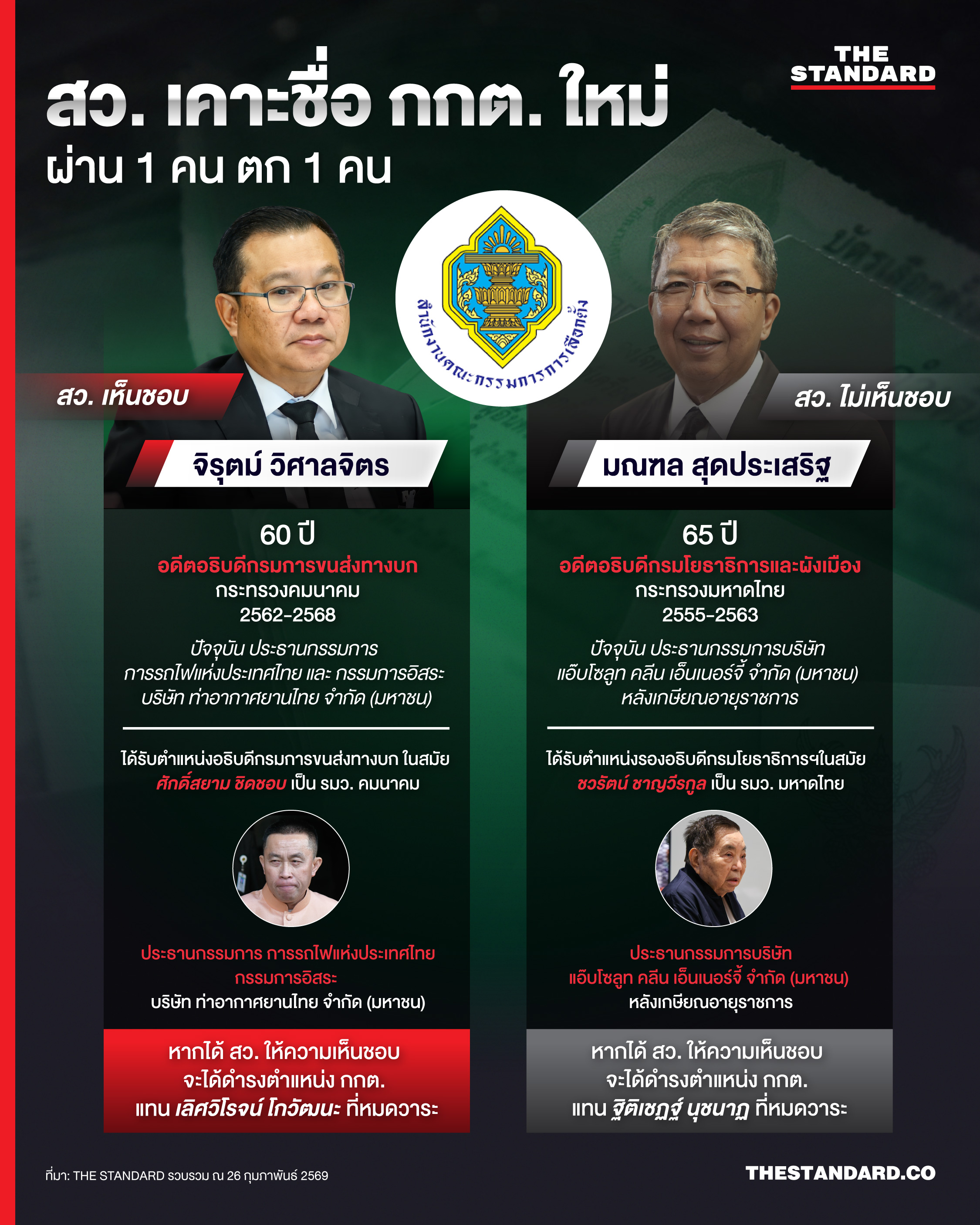 วันนี้ (26 กุมภาพันธ์) ภายหลังการประชุมลับของวุฒิสภาราว 1 ชั่วโมง 30 นาที ในวาระพิจารณาให้ความเห็นชอบบุคคลที่ได้รับการเสนอชื่อเป็นคณะกรรมการการเลือกตั้ง (กกต.) ใหม่ จำนวน 2 คน