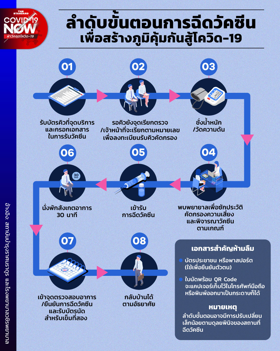 ตั้งแต่สัปดาห์หน้าเป็นต้นไป จะมีประชากรจำนวนมากเข้ารับการฉีดวัคซีนเพื่อสร้างภูมิคุ้มกันโรคโควิด-19 ให้ผ่อนหนักกลายเป็นเบา ตามวันเวลานัดหมายที่คุณได้เลือกไว้ ผ่านเว็บไซต์ไทยร่วมใจ หรือผ่านแอปพลิเคชันเป๋าตัง เราเชื่อว่าหลายคนคงอยากรู้ขั้นตอนการฉีด เพื่อที่จะได้เตรียมตัวและเผื่อเวลาไว้ ดื่มน้ำเยอะๆ นอนพักผ่อนให้เพียงพอ และอย่าลืมตรวจเอกสารสำคัญก่อนออกจากบ้าน ได้แก่ บัตรประชาชน และใบนัดหมายการฉีดที่มี QR Code แสดงอยู่ (อย่าลืมแคปเจอร์หน้าจอโทรศัพท์ที่ขึ้น QR Code หลังนัดวันฉีดเรียบร้อย) เพื่อความสะดวกและราบรื่นในวันฉีดวัคซีน