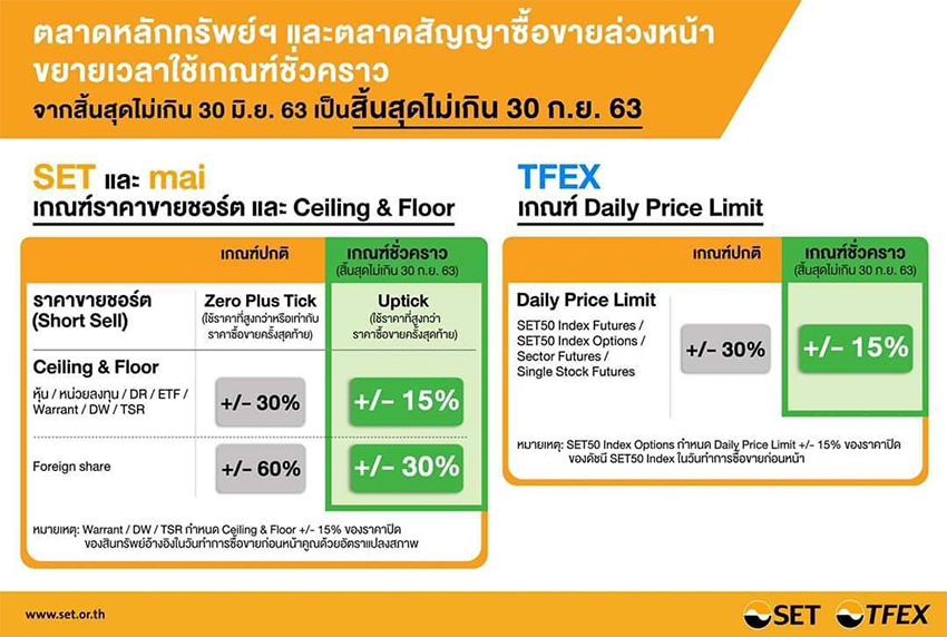 โดยตลาดหลักทรัพย์ฯ ปรับเกณฑ์ราคาเสนอขายชอร์ต (Short Sell) และเกณฑ์ราคาเสนอซื้อขายสูงสุดและต่ำสุด (Ceiling & Floor) ขณะที่ตลาดสัญญาซื้อขายล่วงหน้า (TFEX) ปรับเกณฑ์การเปลี่ยนแปลงราคาซื้อขายสูงสุดในแต่ละวัน (Daily Price Limit) ของ SET50 Index Futures, SET50 Index Options, Sector Futures และ Single Stock Futures