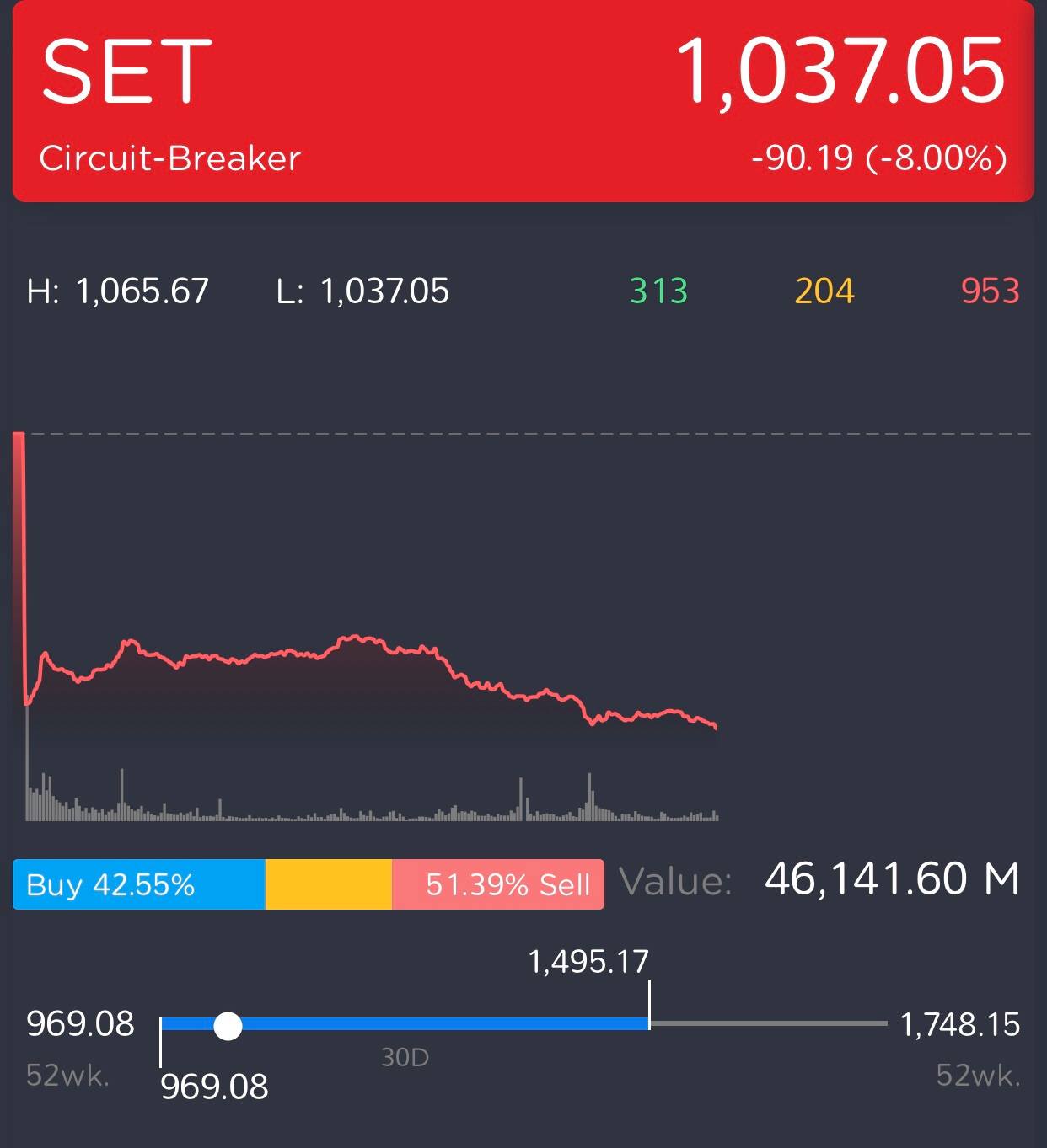 ตลาดหลักทรัพย์แห่งประเทศไทย (SET) ประกาศหยุดทำการซื้อขายหลักทรัพย์ชั่วคราวในวันที่ 23 มีนาคม 2563 เป็นเวลา 30 นาที ตั้งแต่เวลา 15.25-15.55 น. หลังจากดัชนีหุ้นไทย (SET Index) ปรับตัวลดลง 90.19 จุด คิดเป็น 8% จากดัชนีราคาปิดวันทำการก่อนหน้า ถือเป็นการใช้ Circuit Breaker ครั้งแรกหลังจากการปรับเกณฑ์ Circuit Breaker ครั้งล่าสุด