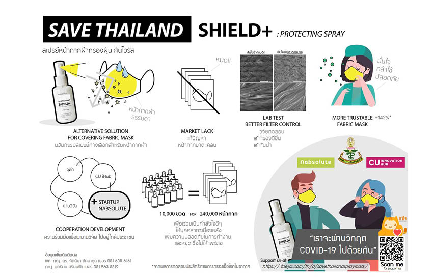 นวัตกรรมสเปรย์มีชื่อว่า ชีลด์พลัส โพรเทคติ้ง สเปรย์ (Shield+ Protecting Spray) เป็นผลงานวิจัยของทีมวิจัย ผศ.ดร.ภญ.จิตติมา ลัคนากุล คณะเภสัชศาสตร์ จุฬาลงกรณ์มหาวิทยาลัย ปราศจากสารที่เป็นอันตรายต่อระบบทางเดินหายใจ ใช้สำหรับพ่นหน้ากากผ้า โดยสเปรย์จะทำหน้าที่เป็นตัวกรองของหน้ากากผ้า ช่วยเพิ่มประสิทธิภาพในการป้องกันไวรัส น้ำ และละอองสารคัดหลั่ง