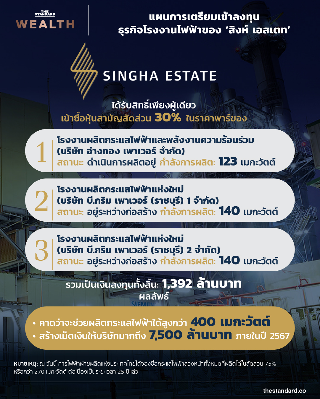 สำหรับแผนการเตรียมเข้าลงทุนโรงผลิตไฟฟ้าและความร้อนร่วม 3 แห่งในครั้งนี้ของ สิงห์ เอสเตท อยู่ในรูปแบบ ‘การได้รับสิทธิ์แต่เพียงผู้เดียว’ ในการเข้าซื้อหุ้นสามัญในสัดส่วน 30% ซึ่งเป็นสิทธิ์การเข้าซื้อที่ราคาพาร์ ในมูลค่างบลงทุนรวมทั้งสิ้น 1,392 ล้านบาท