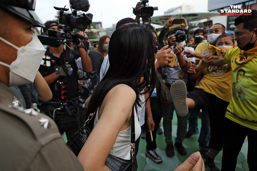 เมื่อถึงเวลากลุ่มมวลชนได้เริ่มร้องเพลงชาติ ตามด้วยเพลงสรรเสริญพระบารมี ขณะที่มวลชนกำลังดำเนินกิจกรรมอยู่นั้น ปรากฏว่ามีหญิงสวมเสื้อสีขาวรายหนึ่งเดินเข้ามาชูสามนิ้วในบริเวณใกล้กับมวลชนและแกนนำ โดยมวลชนรายหนึ่งพยายามปัดมือหญิงคนดังกล่าว และแกนนำที่จัดกิจกรรมได้พยายามเข้าห้ามปราม พร้อมป้องกันไม่ให้มวลชนเข้ามาประชิดตัว แต่ก็มีมวลชนบางส่วนได้พยายามติดตามตัวหญิงคนดังกล่าวไป กระทั่งตำรวจได้เข้ากันตัวและนำตัวหญิงคนดังกล่าวออกจากพื้นที่ทันที
