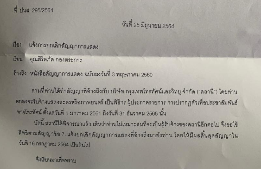 ล่าสุด หมิว-สิริลภัส กองตระการ นักแสดงและพิธีกรสาว เปิดเผยผ่านทางเฟซบุ๊กส่วนตัวว่า วันที่ 30 มิถุนายนที่ผ่านมา เธอได้รับจดหมายจากทางช่องที่สังกัดที่อยู่มาเป็นระยะเวลา 10 กว่าปี ส่งมาแจ้งว่าขอยกเลิกสัญญาการแสดงก่อนกำหนด ซึ่งกำหนดหมดสัญญาเดิมของเธอคือวันที่ 31 ธันวาคม 2565
