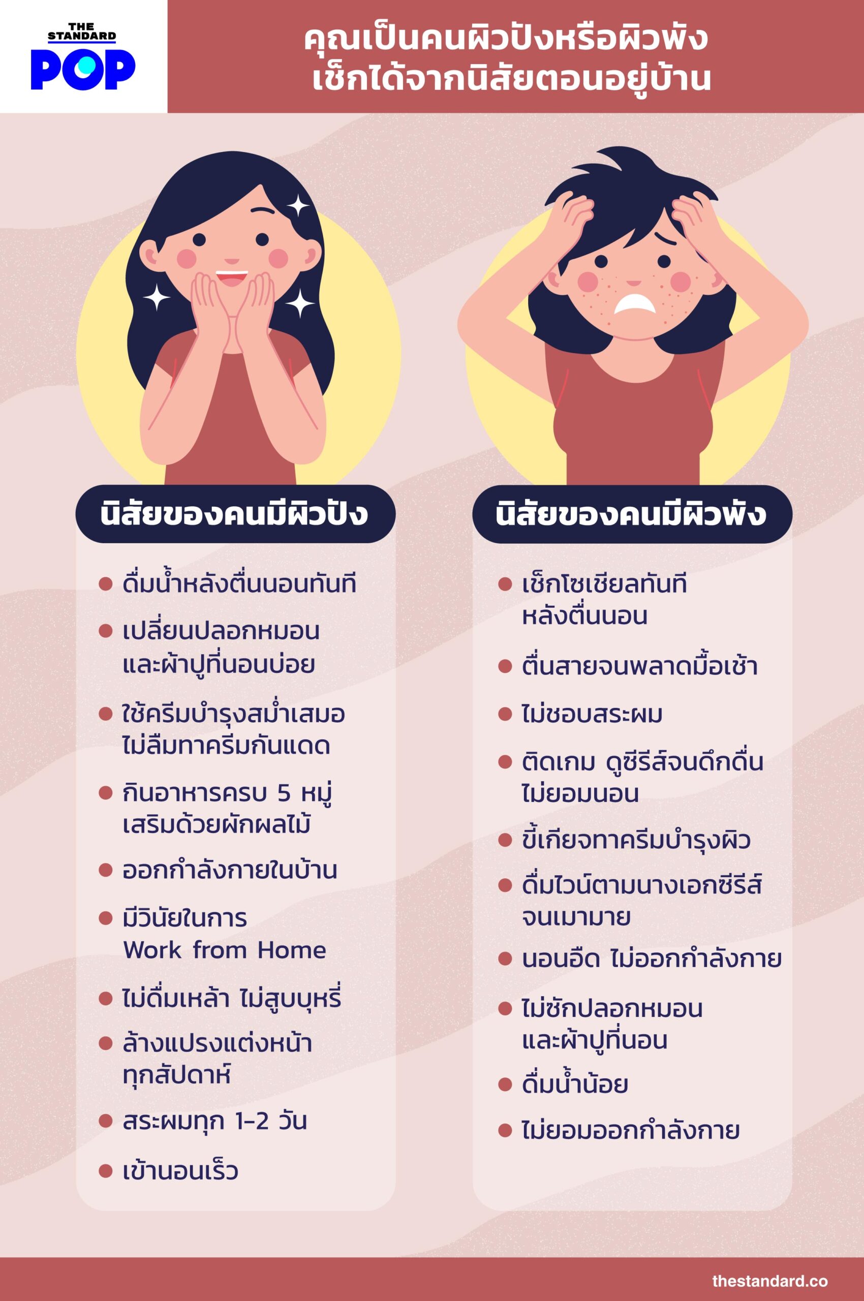 ดูเหมือนว่าช่วงเวลาที่เราต้องใช้ชีวิตอยู่แต่ในบ้านเป็นหลักน่าจะยืดระยะเวลาออกไปอีกยาวนาน (อย่างน้อยก็อีก 1 เดือนนับจากนี้) แม้จะมีข้อดีมากมายในการอยู่บ้าน แต่หาก Work-life Balance ไม่ดี ชีวิตก็อาจเสียสมดุลได้ เช่นกันกับเรื่องผิวพรรณ ใช่ว่าอยู่แต่ในบ้านแล้วผิวจะปลอดภัยไร้กังวลจากมลภาวะ เพราะถ้าคุณลืมเข้มงวดกับตัวเองและเผลอใช้ชีวิตกิน นอน ดื่ม ที่ข้ามเส้นความพอดี ผิวที่เคยดีอาจเสียหายได้จากพฤติกรรมที่ชอบทำตอนอยู่บ้าน THE STANDARD POP จึงอยากชวนคุณมาเช็กกันหน่อยว่ามีแนวโน้มเป็นคนผิวปังหรือผิวพัง ซึ่งเช็กได้จากนิสัยตอนอยู่บ้านดังนี้