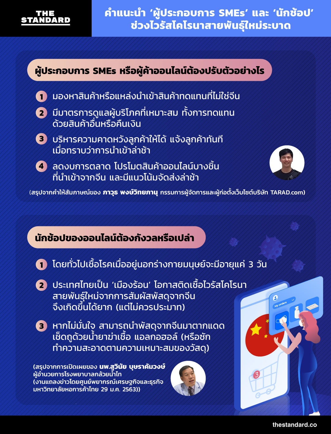 นอกจากผู้ประกอบการธุรกิจยักษ์ใหญ่ในอุตสาหกรรมการท่องเที่ยวและการเดินทางแล้ว ‘ไวรัสโคโรนาสายพันธ์ุใหม่’ ยังทำให้ผู้ประกอบการ SMEs และพ่อค้า แม่ค้าออนไลน์ที่นำเข้าสินค้าจากจีนได้รับผลกระทบไปด้วย โดยเฉพาะความล่าช้าในการขนส่ง แล้วผู้ประกอบการ ผู้ค้าออนไลน์ต้องรับมือในช่วง ไวรัสโคโรนาสายพันธ์ุใหม่ระบาด อย่างไรบ้าง THE STANDARD สรุปคำแนะนำบางส่วนเอาไว้ให้แล้ว