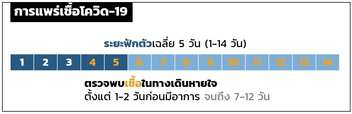 โควิด-19 มีระยะฟักตัวเฉลี่ย 5 วัน และนานที่สุด 14 วัน แต่สามารถตรวจพบเชื้อในทางเดินหายใจได้ก่อน 1-2 วัน ทำให้มีโอกาสแพร่เชื้อก่อนที่จะมีไข้ ไอ เจ็บคอได้