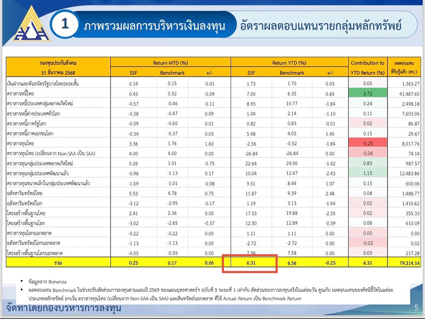 ภาพ : ภาพรวมผลตอบแทนการบริหารเงินลงทุน ‘กองทุนประกันสังคม’ ปี 2568