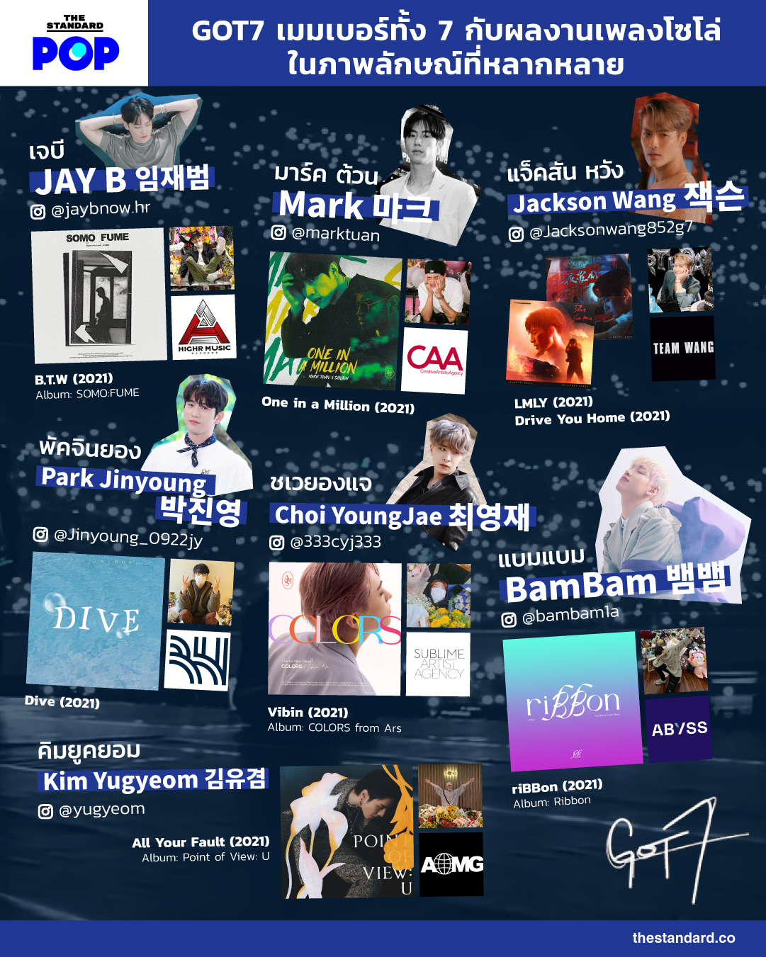 GOT7 คือวงบอยแบนด์สัญชาติเกาหลีที่มีสมาชิก 7 คนได้แก่ เจบี, มาร์ค, แจ็คสัน, พัคจินยอง, ชเวยองแจ, แบมแบม และ คิมยูคยอม สมาชิกทั้ง 7 คนที่แตกต่างด้วยสไตล์อันหลากหลาย แต่สามารถอยู่รวมกันได้อย่างกลมกลืน ก็ได้ทยอยเดินทางสู่เส้นทางของการเป็นศิลปินเดี่ยวไปทีละคน ล่าสุดยองแจก็เป็นสมาชิกคนสุดท้ายที่เดบิวต์เป็นศิลปินเดี่ยวอย่างเป็นทางการ พร้อมกับความตื่นเต้นของเมมเบอร์อย่างแบมแบมและเจบี ที่โพสต์ภาพรวมผลงานเพลงโซโล่ของสมาชิกแต่ละคน รวมถึงเพลง Encore ที่ปล่อยออกมาเมื่อเดือนกุมภาพันธ์ พร้อมข้อความว่า “พวกเราทำสำเร็จ” ข้อความที่แสดงถึงความสัมพันธ์อันเหนียวแน่นระหว่างกัน และความสำเร็จอีกขั้นของเขาทั้งเจ็ดด้วย