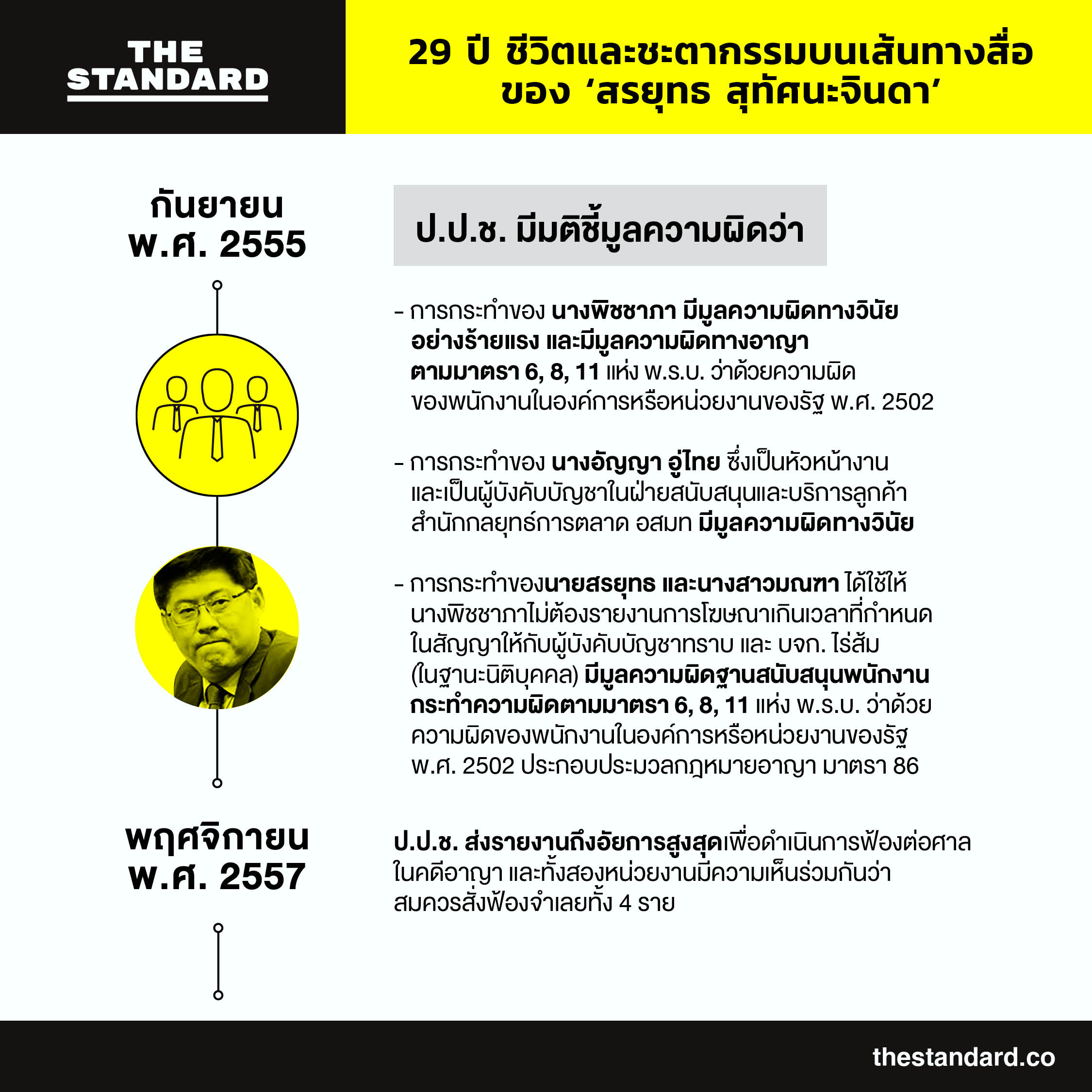 การกระทำของนายสรยุทธ และนางสาวมณฑา ซึ่งได้ใช้ให้นางพิชชาภาไม่ต้องรายงานการโฆษณาเกินเวลาที่กำหนดในสัญญาให้กับผู้บังคับบัญชาทราบ และบริษัทไร่ส้ม (ในฐานะนิติบุคคล) มีมูลความผิดฐานสนับสนุนพนักงานกระทำความผิดตามมาตรา 6, 8, 11 แห่ง พ.ร.บ. ว่าด้วยความผิดของพนักงานในองค์กรหรือหน่วยงานของรัฐ พ.ศ. 2502 ประกอบประมวลกฎหมายอาญา มาตรา 86