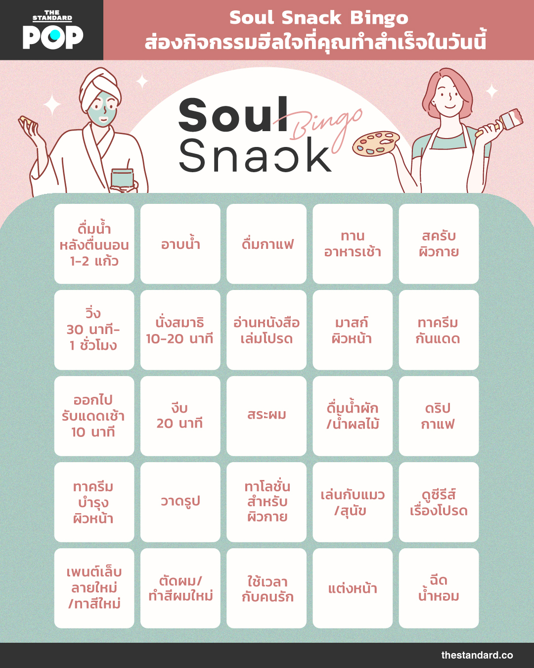 วันหยุดสบายๆ แบบนี้ THE STANDARD POP อยากชวนผู้อ่านมาสำรวจกิจกรรมยามเช้าที่ผ่านมาว่า คุณทำกิจกรรมฮีลใจอะไรที่สำเร็จไปแล้วบ้าง หากทำเสร็จแล้วยังพบว่ามีอีกหลายอย่างที่น่าสนใจและยังไม่ได้ลงมือทำ ก็สามารถลิสต์ไว้เป็นกิจกรรมของเช้าวันต่อไปได้เลย เราสนับสนุนให้ทุกคนหันมาใส่ใจความสุขที่แสนผ่อนคลายให้กับตัวเองบ่อยๆ หากร่างกายเราผ่อนคลาย ได้รับการปรนนิบัติเอาใจใส่อย่างดี จะส่งผลต่อจิตใจที่สอดประสานกันทำให้ Mood ในทุกวันของเราเต็มไปด้วยบรรยากาศดีๆ และความรู้สึกดีๆ อันจะเป็นพลังให้ดำเนินชีวิตในแต่ละวันด้วยความสุขและเบิกบาน และหากจะเจอเรื่องทุกข์ใจหรือปัญหาที่แวะผ่านเข้ามาบ้าง ร่างกายและจิตใจที่เข้มแข็งมีพลังจะสามารถรับมือกับปัญหาเหล่านั้นได้ดีอย่างแน่นอน