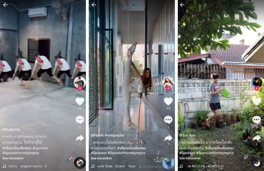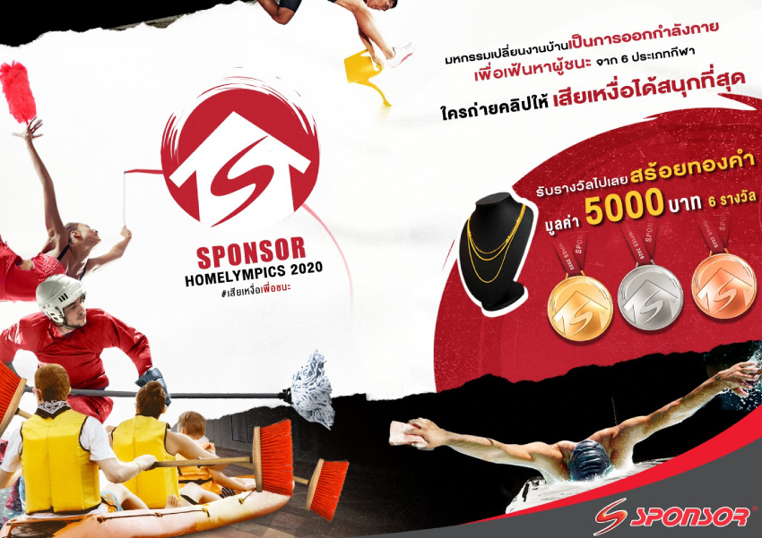 งานนี้สปอนเซอร์ครีเอตกิจกรรมได้อย่างสนุกสนาน โดยชักชวนให้ทุกคนเปลี่ยนงานบ้านที่น่าเบื่อมาเป็นการออกกำลังกายสุดสร้างสรรค์ เพื่อเฟ้นหาผู้ชนะที่จะได้รับเหรียญทอง Sponsor Homelympics พร้อมสร้อยคอทองคำมูลค่า 5,000 บาท ทั้งนี้กิจกรรม เสียเหงื่อเพื่อชนะ Sponsor Homelympics 2020 มีผู้ส่งคลิปร่วมสนุกกันเป็นจำนวนมาก และได้มีการประกาศรางวัลกันไปเป็นที่เรียบร้อยแล้ว เรียกได้ว่ากิจกรรม ‘เสียเหงื่อเพื่อชนะ’ เป็นแรงจูงใจให้ทุกคนลุกขึ้นมาออกกำลังกายและส่งต่อแรงบันดาลใจในการออกกำลังกายให้คนอื่นๆ ได้อย่างสร้างสรรค์อีกด้วย