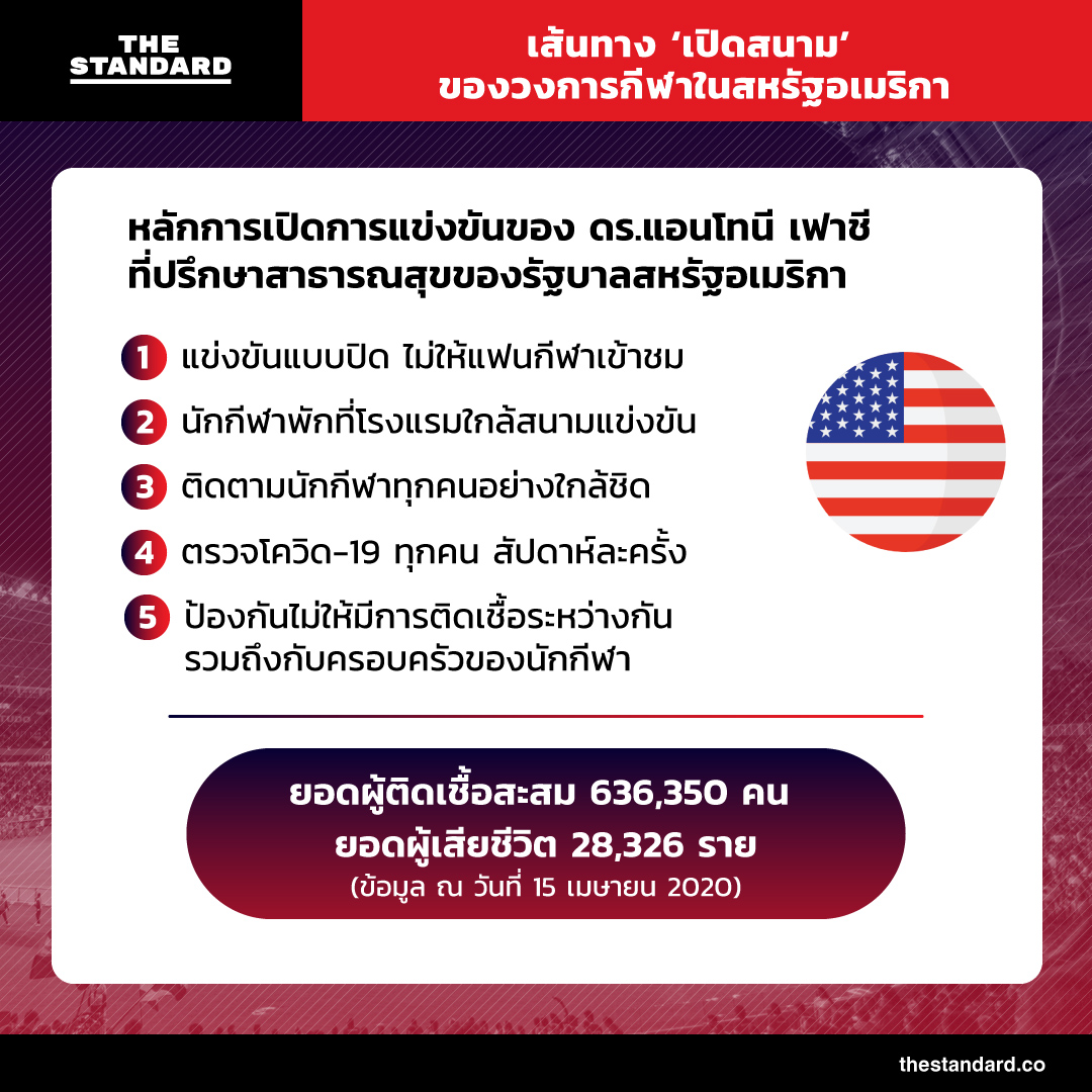 แต่ล่าสุดทางด้าน ดร.แอนโทนี เฟาชี ที่ปรึกษาสาธารณสุขของรัฐบาลสหรัฐอเมริกา ได้ออกมาเปิดเผยแนวทางและหลักการ หากวันหนึ่งในอนาคต กีฬาในประเทศจะสามารถกลับมาแข่งขันได้ ผ่านบทสัมภาษณ์ของ Vanity Fair แต่ทุกอย่างขึ้นอยู่กับสถานการณ์การแพร่ระบาดภายในประเทศหลายเดือนต่อจากนี้