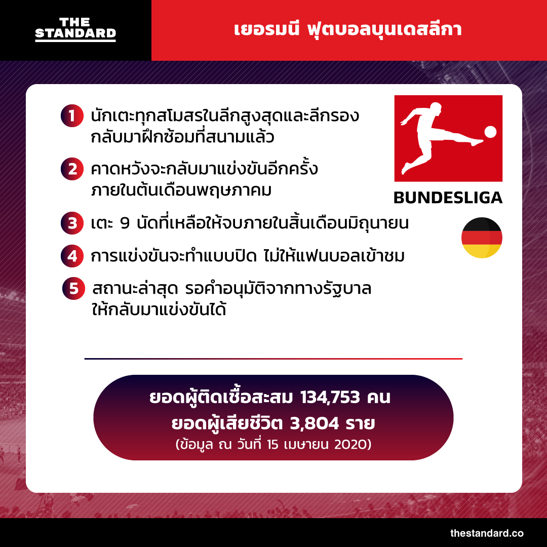 โดยฟุตบอลลีกยุโรปในเวลานี้ มีฟุตบอลบุนเดสลีกาและบุนเดสลีกา 2 ของเยอรมนีที่ได้ให้นักเตะจากทุกสโมสรกลับมาลงฝึกซ้อมเป็นกลุ่มเล็กๆ เพื่อรอวันที่รัฐบาลจะอนุญาตให้กลับมาลงแข่งขันแบบปิด ไม่ให้แฟนบอลเข้าชมได้