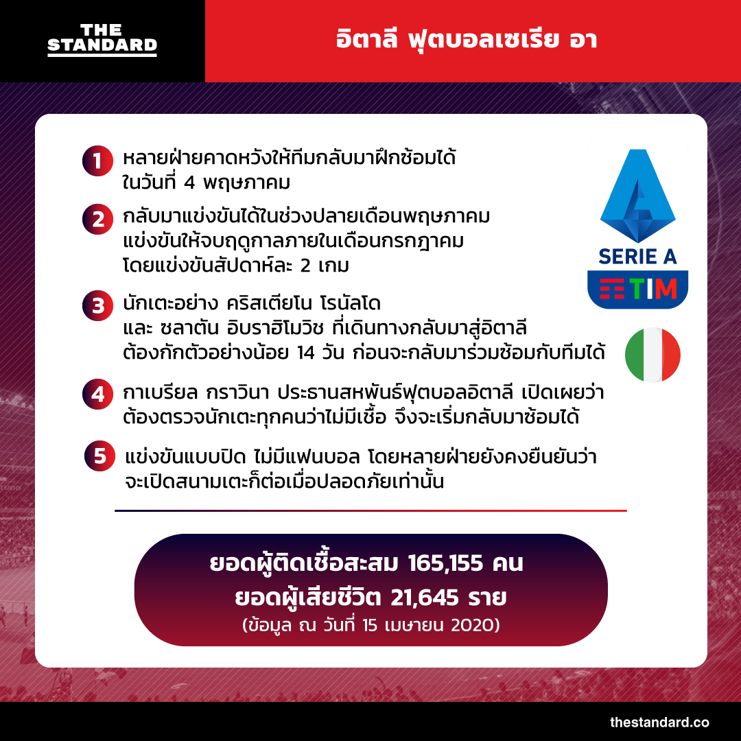 ขณะที่กัลโช เซเรีย อา อิตาลี หลังจากที่หลายฝ่ายเริ่มมองว่า ประเทศได้พ้นจุดพีกของการติดเชื้อไวรัสโคโรนา 2019 ไปแล้ว ภายในประเทศจึงเริ่มมีการพูดคุยถึงการนำพาฟุตบอลคืนสู่สนามแข่งขัน โดยมาตรการต่างๆ ที่เริ่มได้รับการเสนอมาภายในประเทศคือ การกักตัวนักฟุตบอลที่เดินทางกลับมาจากต่างประเทศเป็นเวลา 2 สัปดาห์ ก่อนจะให้ลงฝึกซ้อมร่วมกับทีมได้ โดยการฝึกซ้อมของทีมในเซเรีย อามีข้อเสนอให้เริ่มต้นในช่วงต้นเดือนพฤษภาคมนี้ โดยให้นักเตะทุกคนผ่านการตรวจโควิด-19 อีกครั้ง และแข่งขันแบบ 2 นัดต่อสัปดาห์ เพื่อให้ฤดูกาลจบภายในเดือนกรกฎาคม 2020