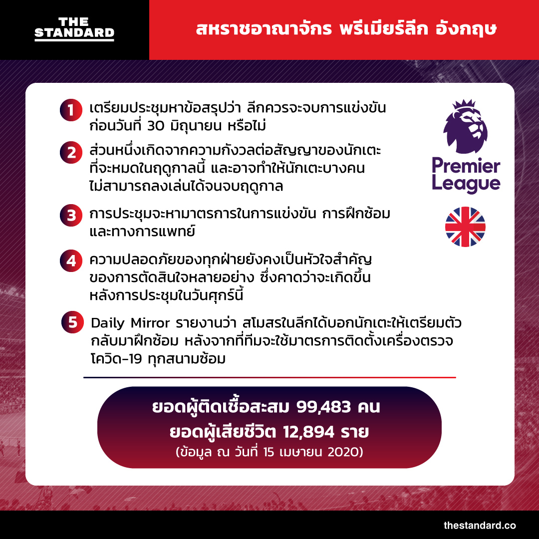 ฟุตบอลพรีเมียร์ลีก อังกฤษ ถือว่ายังอยู่ในจุดที่ศึกษาและพูดคุยถึงหนทางที่จะนำพาฟุตบอลกลับมาแข่งขันได้ โดยปัญหาใหญ่ที่สุดของลีกของลิขสิทธิ์การถ่ายทอดสด ซึ่งหากพรีเมียร์ลีกไม่สามารถแข่งขันจบได้ จะส่งผลกระทบต่อลีกเป็นเม็ดเงินสูงถึง 1.2 พันล้านปอนด์ เฉพาะลิขสิทธิ์กับผู้ถ่ายทอดสดภายในประเทศ ทางลีกจึงจำเป็นต้องหาหนทางให้กลับมาแข่งขันจนจบฤดูกาล