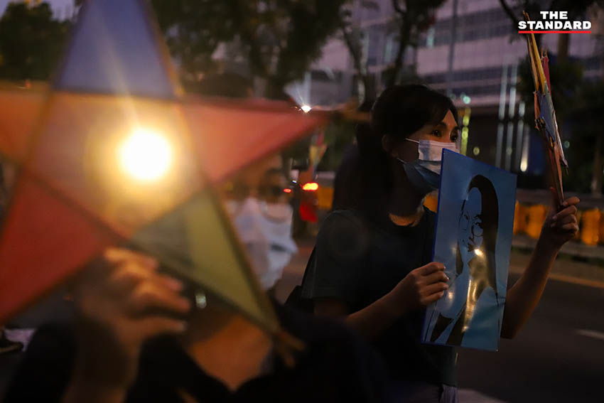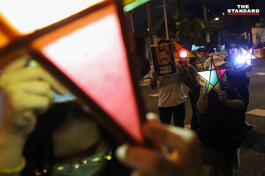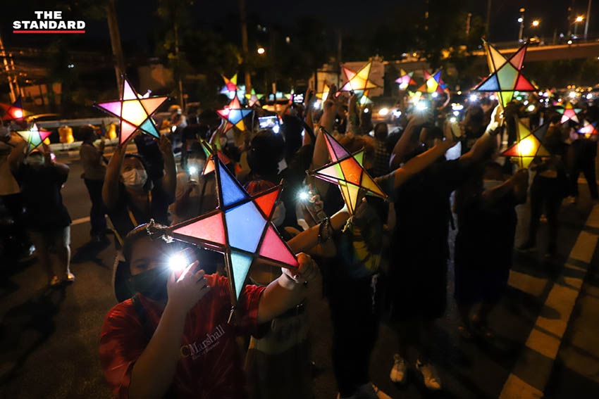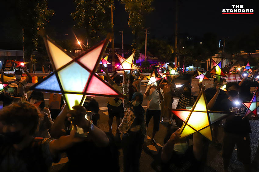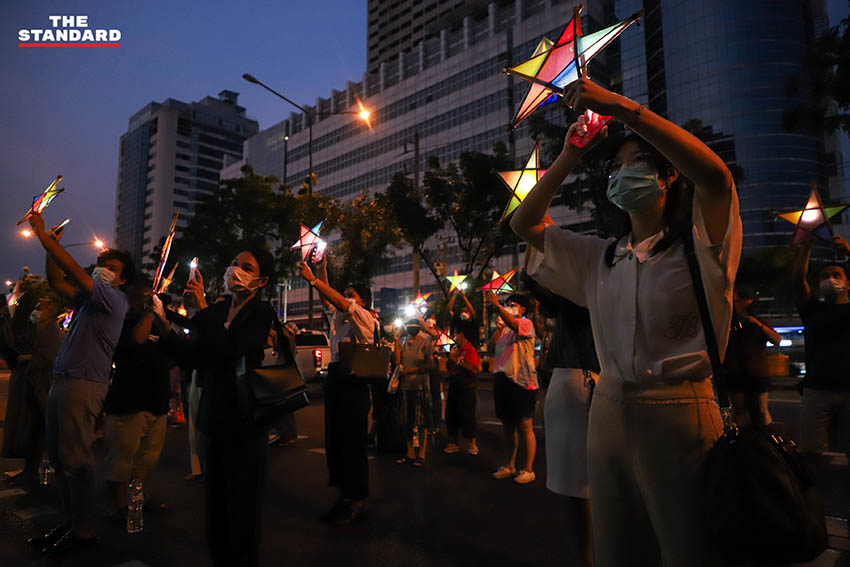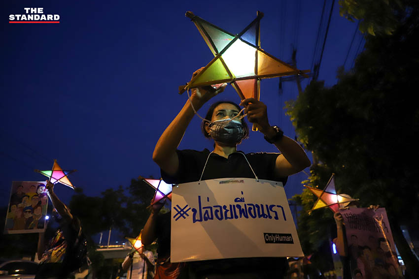 ในเวลาต่อมาผู้ร่วมกิจกรรมได้ชูดาวกระดาษ ส่องไฟ และชูสัญลักษณ์ 3 นิ้ว พร้อมตะโกนเรียกร้อง ‘ปล่อยเพื่อนเรา’ ก่อนยุติกิจกรรม