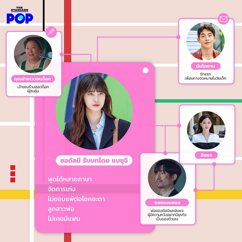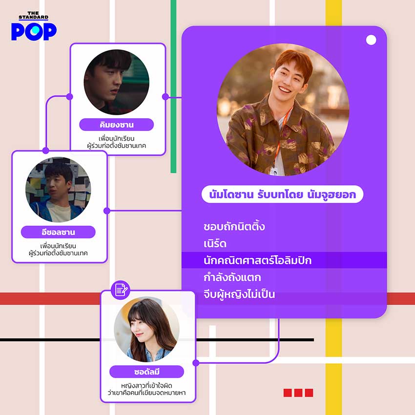 *ซอดัลมี (รับบทโดย แบซูจี) – ผู้หญิงที่จะเป็นรักแรกของเขา ทำให้เขาเปลี่ยนแปลงตัวเองจากเนิร์ดสุดๆ มาเป็นว่าที่สตาร์ทอัพที่อาจประสบความสำเร็จที่สุด เรียกได้ว่าเป็นการค้นพบแสงสว่างในกันและกันของทั้งคู่ที่ต่างล้มลุกคลุกคลานในชีวิตการทำงาน นำเอาประสบการณ์เหล่านั้นมาเป็นตัวต่อยอดจนประสบความสำเร็จในที่สุด