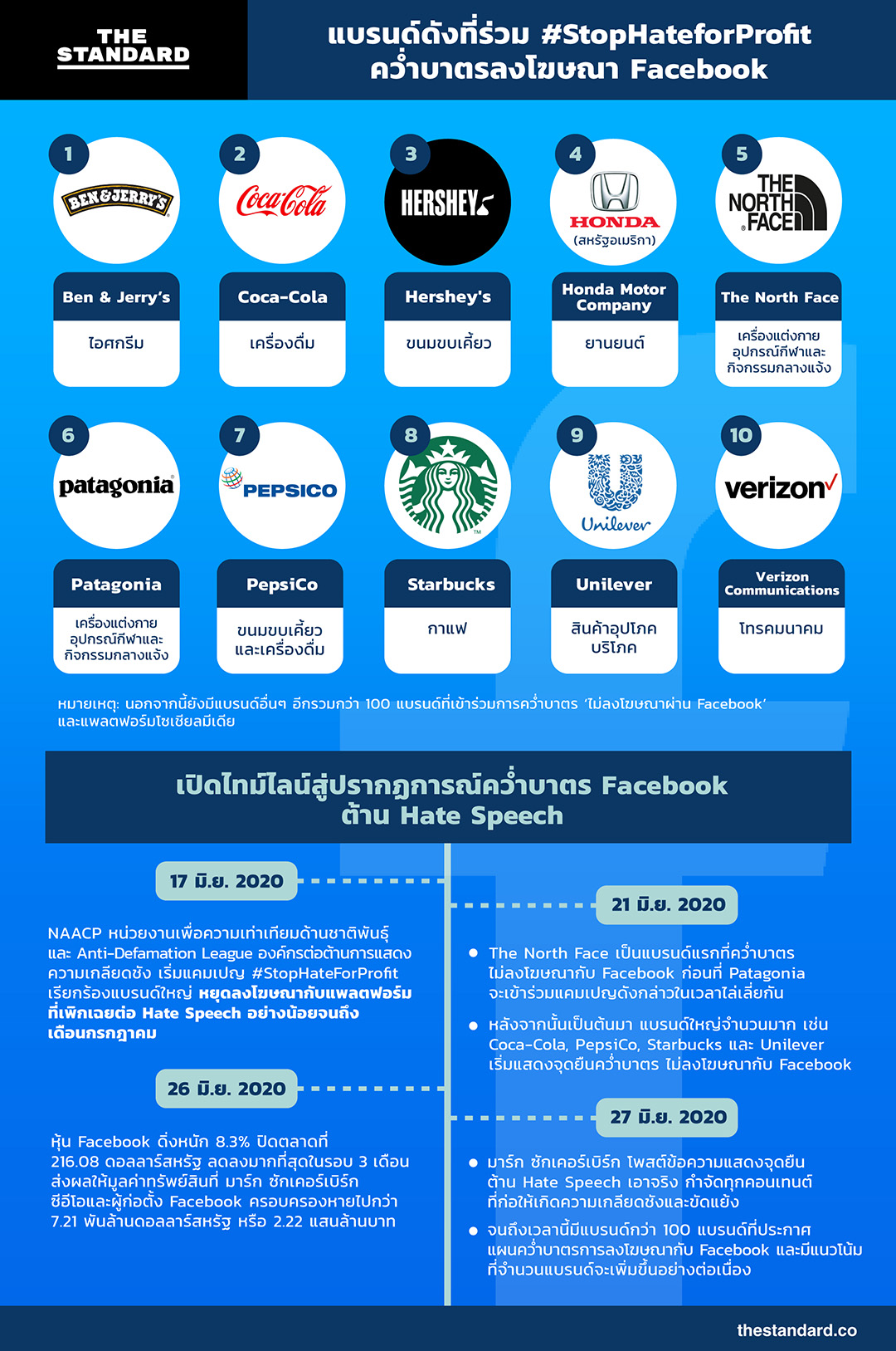 - จนถึงเวลานี้มีแบรนด์กว่า 100 แบรนด์ ที่ประกาศแผนคว่ำบาตรการลงโฆษณากับ Facebook และมีแนวโน้มที่จำนวนแบรนด์จะเพิ่มขึ้นอย่างต่อเนื่อง