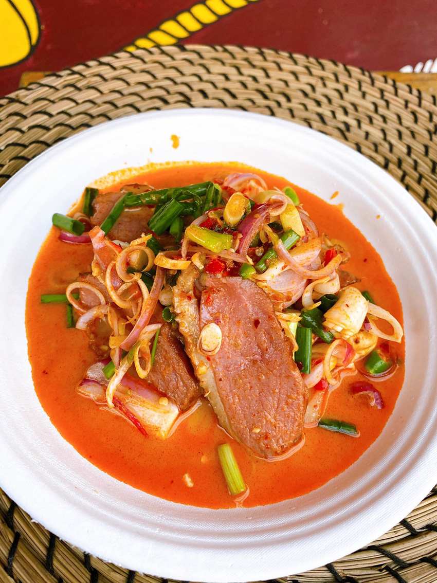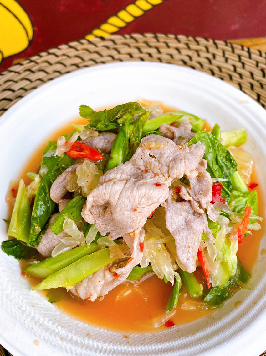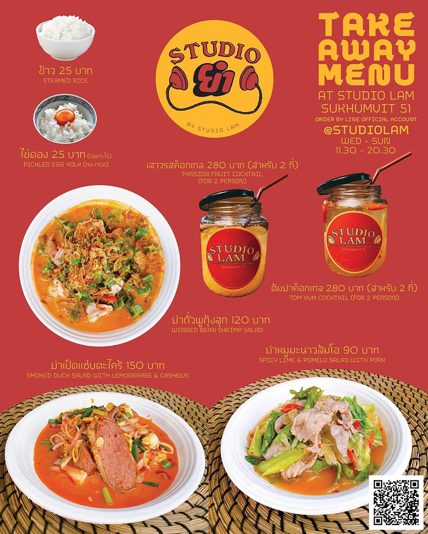 เบนเล่าให้เราฟังว่า ด้วยความที่ทางทีมบาร์ของ Studio Lam เคยทำงานในครัวไทยมาก่อน จึงเกิดไอเดียใหม่เกิดเป็นร้านยำเฉพาะกิจนามคล้องจองกับร้านว่า Studio Yum (สตูดิโอยำ) เสิร์ฟเมนูยำรสจัดจ้านอย่าง ยำเป็ดแซ่บตะไคร้ (150 บาท) ยำหมูมะนาวส้มโอ (90 บาท) ยำถั่วพูกุ้งสุก (120 บาท) และข้าวสวยไข่ดอง (50 บาท) ทั้งหมดเสิร์ฟแบบ Pick-up รับของที่หน้าร้าน หรือจะเรียกรถมารับที่ร้านก็ได้ ผ่านทาง LINE: @Studiolam ยำกันทุกวันพุธ-อาทิตย์ เวลา 11.30-20.30 น.