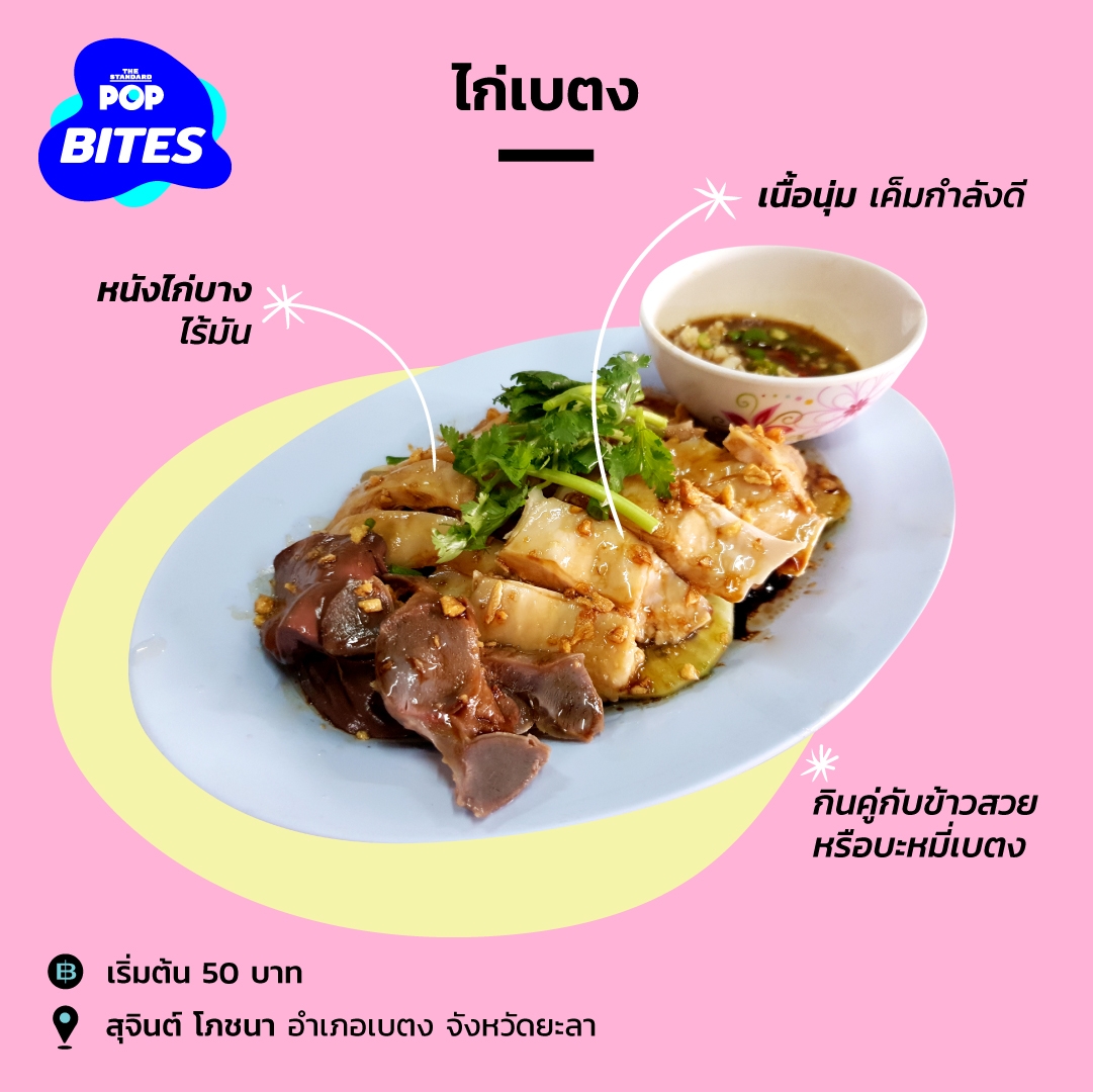 ช่วง 2-3 ปีมานี้ เมนูข้าวมันไก่เบตงมาแรงมาก และหลังจากที่เราได้ไปสัมผัสไก่เบตงมาถึงถิ่น เราพบว่า ไก่เบตงนั้นอร่อยจริง! หนังบาง เนื้อนุ่ม ไม่มีมันผสม (ขนาดผู้เขียนไม่ชอบกินหนังนะ) ไก่เบตงเป็นไก่พันธุ์เนื้อพื้นเมืองที่นำพันธุ์มาจากประเทศจีน เรียกว่าไก่กวางไส ติดอันดับหนึ่งในไก่เนื้อที่มีราคาแพงที่สุดในประเทศไทย ถ้าไปที่อำเภอเบตง มีเมนูไก่เบตงวางขายแทบทุกร้าน ส่วนใหญ่เป็นไก่ต้มเสิร์ฟมาคู่กับซอสถั่วเหลือง โรยหน้าด้วยกระเทียมและผักโรย กินคู่กับข้าวสวย และบักกุ๊ดเต๋ หรือบะหมี่เบตงก็ได้