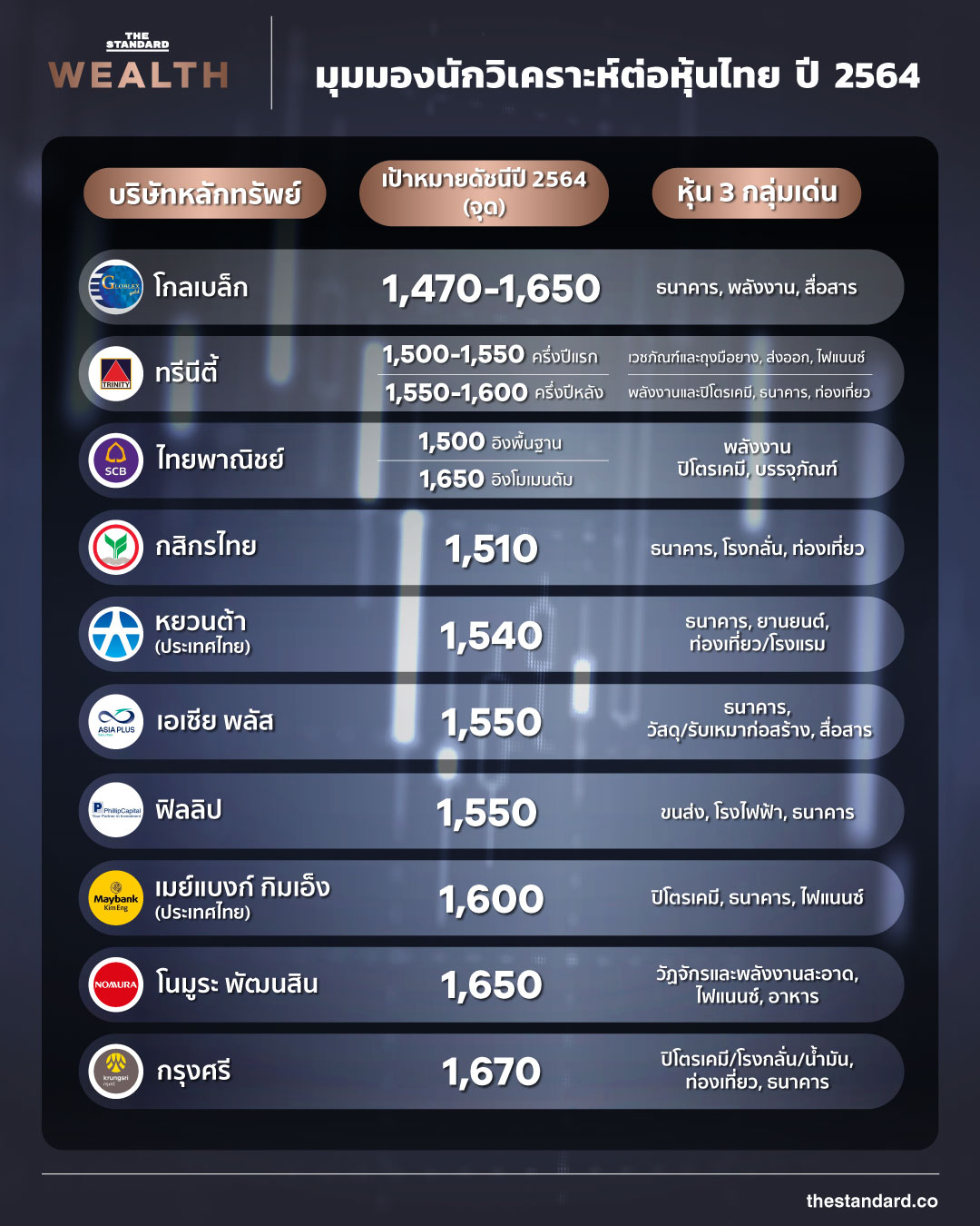 มองไปในปี 2564 จากการสำรวจความเห็นของนักวิเคราะห์ 10 ราย จาก 10 บริษัทหลักทรัพย์ ต่างเชื่อว่าดัชนี SET มีโอกาส ‘ฟื้นตัว’ ต่อได้ โดยดัชนีเป้าหมายต่ำสุดที่ประเมินไว้คือ 1,470 จุด และสูงสุดที่ 1,670 จุด ปัจจัยหนุนสำคัญคือการฟื้นตัวของเศรษฐกิจ หลังจากที่เผชิญกับวิกฤตโควิด-19 ในปี 2563 ทำให้กำไรของบริษัทจดทะเบียน ในปี 2564 มีโอกาสฟื้นตัวขึ้นมาได้