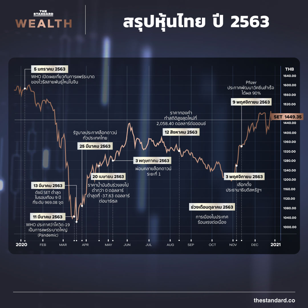จากจุดต่ำสุด SET ใช้เวลาอีกประมาณ 3 เดือน ฟื้นตัวขึ้นมาแตะระดับ 1,454.95 จุด หรือ +50% ก่อนที่ดัชนีจะค่อยๆ ซึมลงอีกครั้ง กลับไปแตะระดับ 1,187.49 จุด เมื่อสิ้นเดือนตุลาคมที่ผ่านมา ก่อนที่ดัชนีจะได้แรงหนุนจากการกลับเข้าซื้อของนักลงทุนต่างชาติในช่วง 2 เดือนสุดท้ายของปี มูลค่ากว่า 3 หมื่นล้านบาท และปัจจัยบวกจากความสำเร็จของการพัฒนาวัคซีน ทำให้ดัชนี SET ฟื้นกลับมาปิดที่ระดับ 1,449.35 จุด ลดลงจากปีก่อนเพียง 130.49 จุด หรือ 8.26%