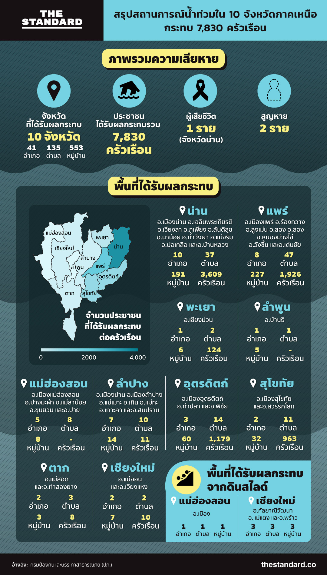 ทำให้ล่าสุดมีรายงาน 10 จังหวัดภาคเหนือของประเทศไทย รวม 41 อำเภอ 135 ตำบล 553 หมู่บ้าน ประชาชนได้รับผลกระทบ มีผู้เสียชีวิตแล้ว 1 ราย และผู้สูญหาย 2 ราย