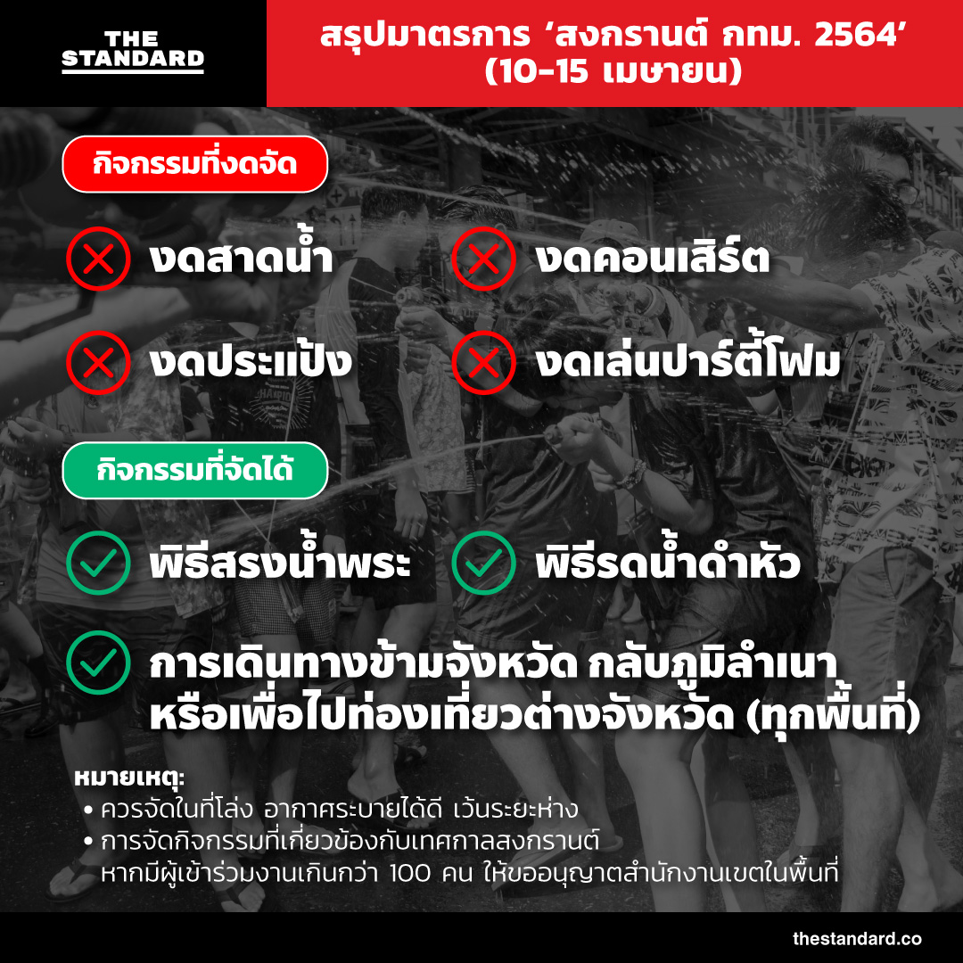 พล.ต.อ. อัศวิน ขวัญเมือง ผู้ว่าราชการกรุงเทพมหานคร เปิดเผยว่า เนื่องจากในช่วงเทศกาลสงกรานต์ของแต่ละปี จะมีการจัดงานหรือกิจกรรมเพื่อส่งเสริมประเพณีและวัฒนธรรม ส่งเสริมการท่องเที่ยวและเศรษฐกิจ มีการเล่นสาดน้ำ ประแป้ง มีการรวมกลุ่มคนเป็นจำนวนมาก และอาจเกิดภาวะไร้ระเบียบ คณะกรรมการโรคติดต่อกรุงเทพมหานคร ในการประชุมครั้งที่ 6/2564 เมื่อวันที่ 19 มีนาคม 2564 จึงมีมติเห็นชอบมาตรการเพื่อเฝ้าระวัง ป้องกัน และควบคุมการแพร่ระบาดของโรคติดเชื้อไวรัสโคโรนา 2019 (โควิด-19) ในช่วงเทศกาลสงกรานต์ (ระหว่างวันที่ 10 เมษายน 2564 ถึงวันที่ 15 เมษายน 2564) ดังต่อไปนี้