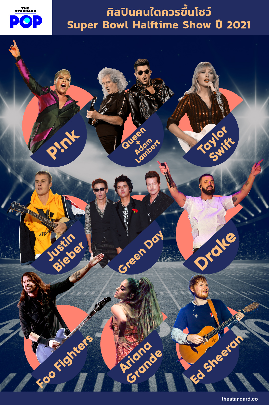 เชื่อว่าหลายคนยังคงดูโชว์ Super Bowl Halftime Show ปีนี้ของ ชากีรา และ เจนนิเฟอร์ โลเปซ วนไปหลายๆ รอบ แต่ THE STANDARD POP ขอคิดการณ์ไกลไปอีก 12 เดือนข้างหน้า สำหรับงาน Super Bowl LV ครั้งที่ 55 ซึ่งจะจัดเช้าวันที่ 8 กุมภาพันธ์ ที่เมืองแทมปา รัฐฟลอริดา พร้อมตัวเลือกศิลปินที่เราคิดว่าจะมีโอกาสขึ้นโชว์ในช่วงพักครึ่ง ส่วนถ้ามีศิลปินคนอื่นในใจที่ไม่อยู่ในภาพนี้ ก็คอมเมนต์กันได้เลย อ้อ ความจริงเราอยากใส่ชื่อ ริฮานนา ไว้ในในลิสต์ด้วยอีกคน เพราะเธอเคยโดนทาบทามให้ขึ้นโชว์มาแล้ว แต่ก็กลัวว่า เธอจะยังไม่ออกเพลงใหม่ภายในปีหน้าและดูเหมือน ริฮานนา จะยังยุ่งๆ กับการขายเครื่องสำอางของเธอแบบยาวๆ ในช่วงนี้